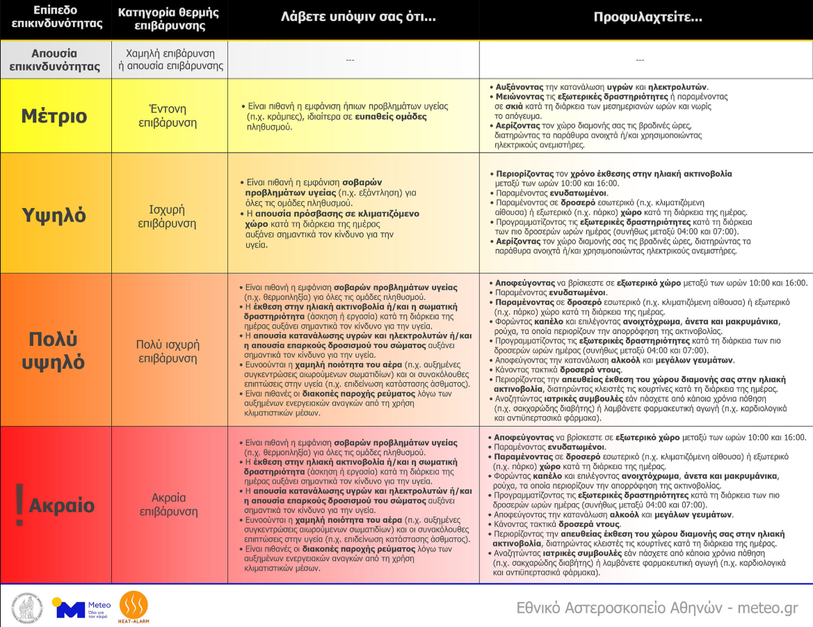 Δείτε τον πίνακα με τις οδηγίες σε αυτόν τον σύνδεσμο: https://www.meteo.gr/UploadedFiles/articlePhotos/JUL25/heatalarm1.jpg