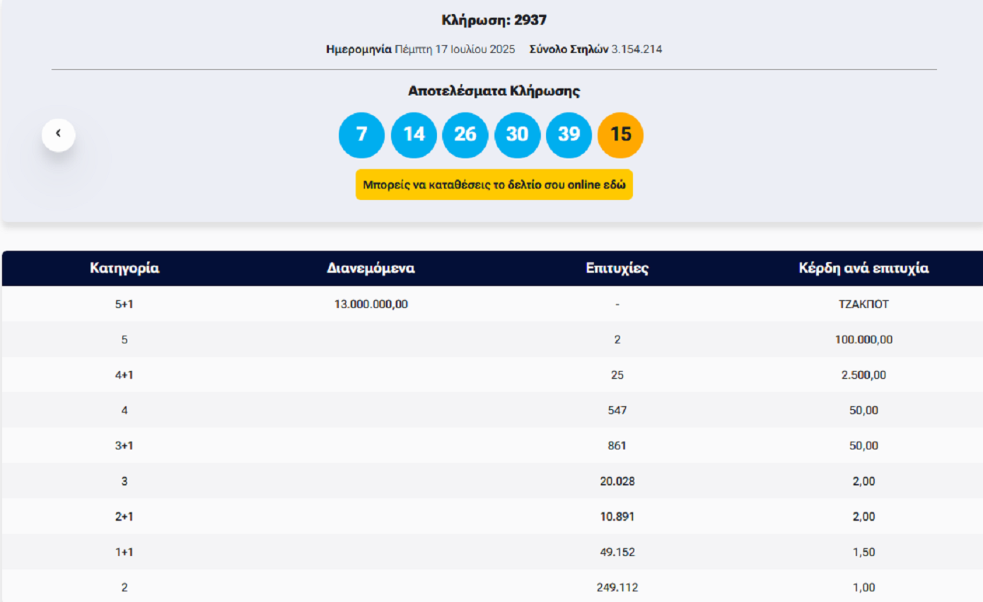 Πραγματοποιήθηκε το βράδυ της Πέμπτης 17 Ιουλίου η υπ’ αριθμόν 2937 κλήρωση Τζόκερ του ΟΠΑΠ, που μοιράζει στους τυχερούς της πρώτης κατηγορίας τουλάχιστον 13.000.000 ευρώ.
