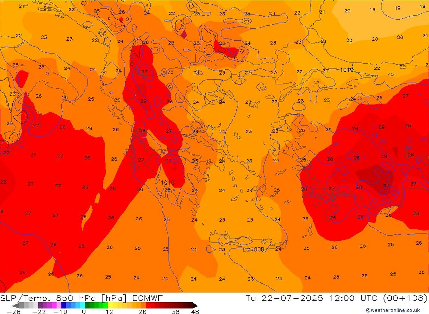 Αιτία γι’ αυτή την εξέλιξη, όπως φαίνεται και στον πρώτο χάρτη με το έντονο κόκκινο χρώμα, οι πολύ θερμές αέριες μάζες, οι οποίες ξεχύνονται από τις ακτές της βόρειας Αφρικής προς την ανατολική λεκάνη της Μεσογείου επηρεάζοντας και τη χώρα μας.