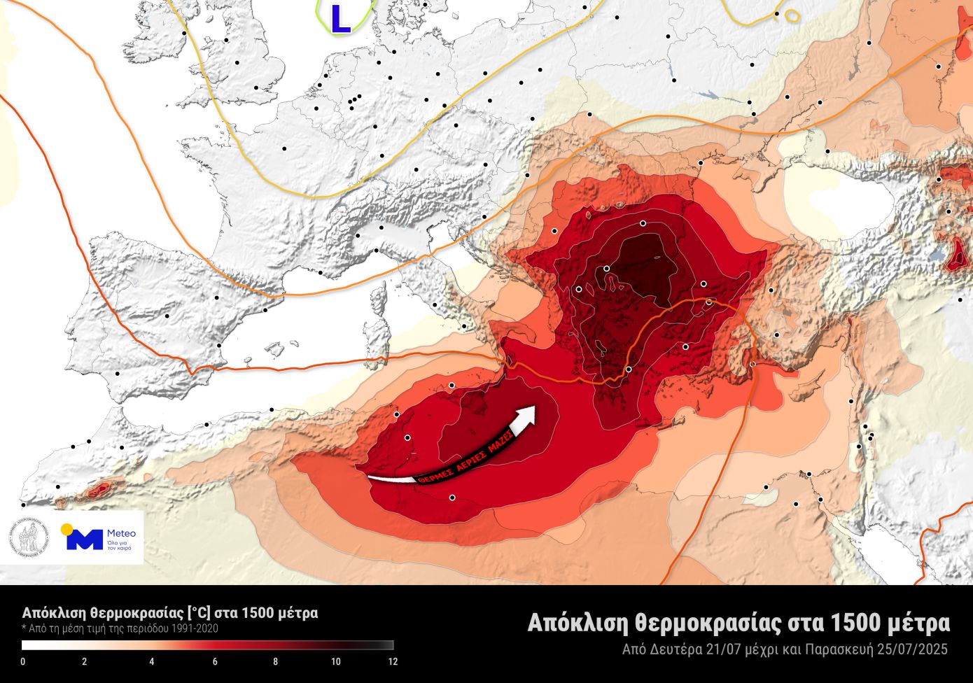 Όπως διακρίνεται στον χάρτη, η θερμοκρασία στο επίπεδο των 850 hPa (περίπου 1500 μέτρα από την επιφάνεια της θάλασσας) κατά το χρονικό διάστημα από τη Δευτέρα 21/07 μέχρι και την Παρασκευή 25/07 στα Βαλκάνια θα είναι έως και 10 βαθμούς υψηλότερη από τη μέση τιμή της περιόδου 1991–2020.