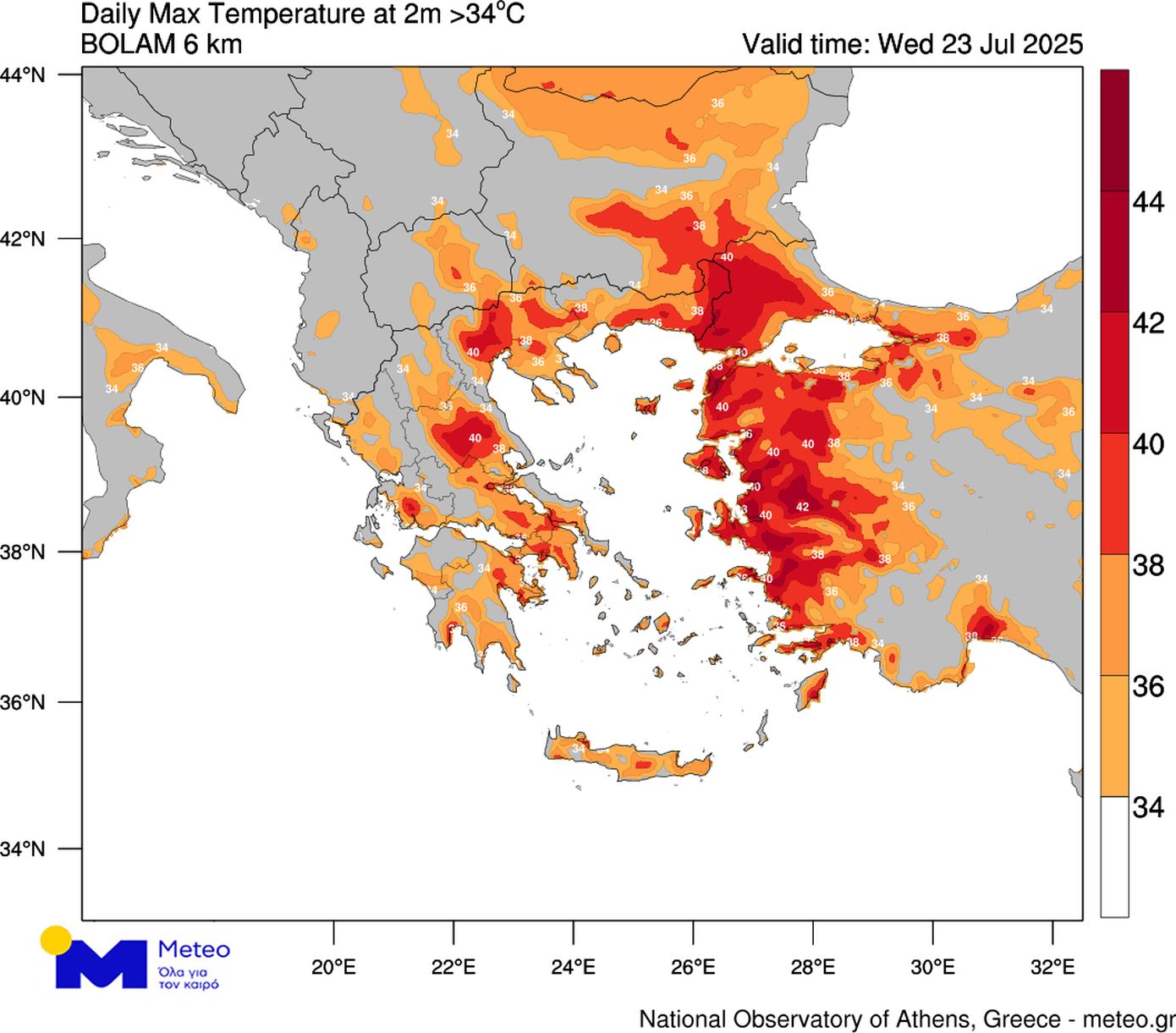Σύμφωνα και με τα νεότερα προγνωστικά στοιχεία του meteo.gr/Εθνικού Αστεροσκοπείου Αθηνών, συνθήκες καύσωνα θα επικρατήσουν σε πολλές περιοχές της χώρας την Τετάρτη 23/07. Για μία ακόμα ημέρα οι υψηλότερες μέγιστες θερμοκρασίες θα εντοπίζονται κυρίως στα ανατολικά, κεντρικά και βόρεια ηπειρωτικά και στα νησιά του Ανατολικού Αιγαίου. Στον προγνωστικό χάρτη, με κόκκινες αποχρώσεις τονίζονται οι περιοχές όπου η μέγιστη θερμοκρασία θα ξεπεράσει τους 38 °C, ενώ με έντονες αποχρώσεις τονίζονται οι περιοχές όπου η μέγιστη θερμοκρασία θα φτάσει στους 40-44 °C.