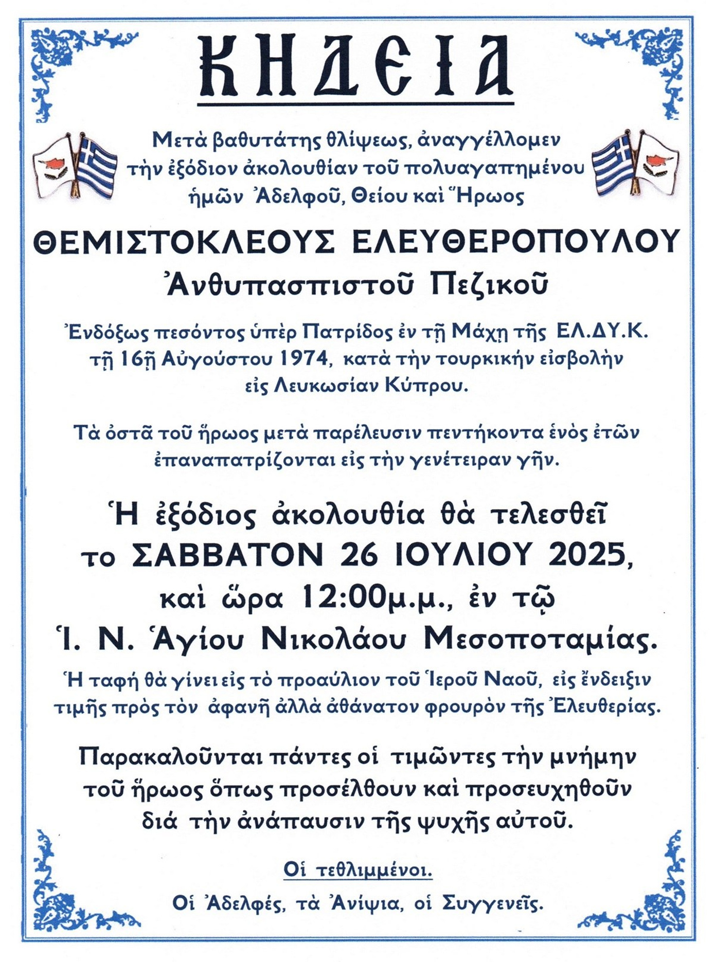 Ἐκ μέρους τῶν ἀδελφῶν τοῦ ἀειμνήστου Θεμιστοκλῆ Ελευθεροπούλου Ἀνθυπασπιστοῦ Πεζικοῦ, ὁ ὁποῖος ἔπεσε ἡρωικῶς μαχόμενος ὑπὲρ πίστεως καὶ πατρίδος κατὰ τὴν Μάχην τῆς ΕΛΔΥΚ στὴν Κύπρο, σᾶς διαβιβάζομεν συνημμένως τὸ ἀγγελτήριον τῆς Ἐξοδίου Ἀκολουθίας του.