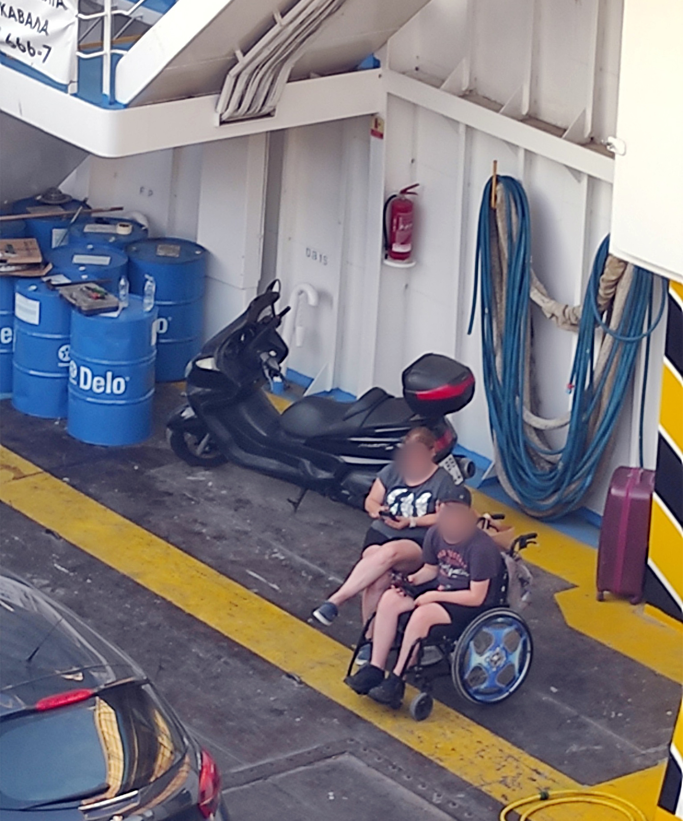 «Τρίτη απόγευμα στις 20:00 δρομολόγιο Λιμένας – Κεραμωτή. Πλοίο, Ιωάννης Σοφία της Thassos Seaways. Για ακόμα μια φορά ντράπηκα που είμαι άνθρωπος. Ένα άτομο σε αμαξίδιο, με τη σύνοδο του, ταξίδευαν μαζί με τα αυτοκίνητα γιατί προφανώς δεν υπάρχει τρόπος να ανέβει το αμαξίδιο στον χώρο των επιβατών», αναφέρει η Εύη Ζουμπουλίδου, η μάρτυρας που δημοσίευσε το περιστατικό.