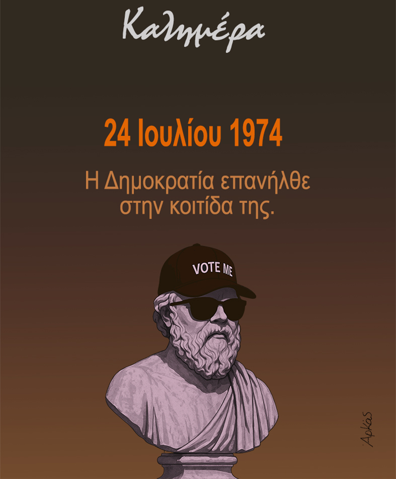 Ο γνωστός σκιτσογράφος, Αρκάς, αφιερώνει τη σημερινή «Καλημέρα» στην 24η Ιουλίου 1974, επέτειο της αποκατάστασης της Δημοκρατίας στην Ελλάδα και 51 χρόνια από τη Μεταπολίτευση.
