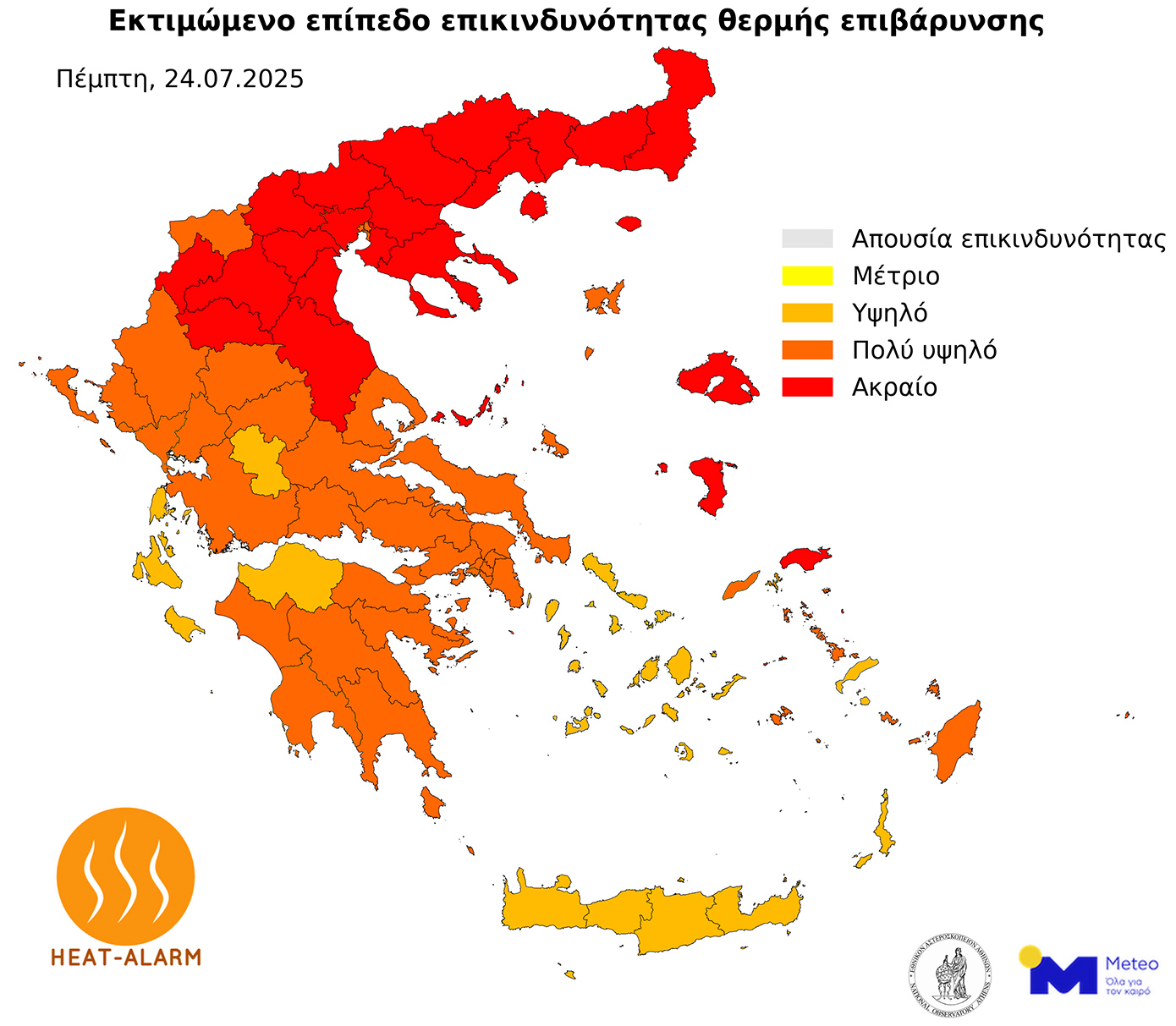 την Πέμπτη 24/07 πολύ υψηλή θερμική επιβάρυνση στις περισσότερες περιοχές της χώρας. Ακραία θερμική επιβάρυνση στη Θεσσαλία, στα βόρεια ηπειρωτικά και στα νησιά του Ανατολικού Αιγαίου.