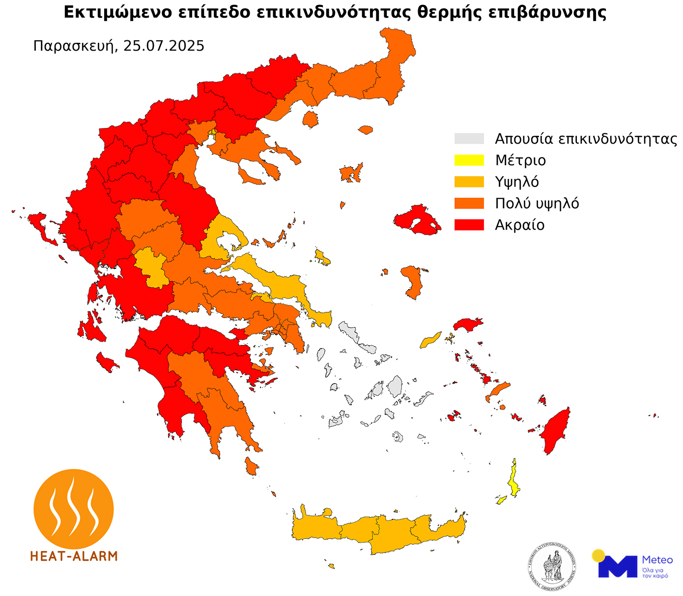 Υποχρεωτική παύση υπαίθριων εργασιών 12:00-17:00: Για την Παρασκευή 25 Ιουλίου, προβλέπεται υποχρεωτική διακοπή εργασιών σε εξωτερικούς χώρους, μεταξύ 12:00 και 17:00, σε περιοχές όπου σύμφωνα με την ΕΜΥ αναμένονται ιδιαίτερα υψηλές θερμοκρασίες και επίπεδα δυσφορίας (WBGT). Η απόφαση αφορά όλες τις περιοχές της χώρας, εκτός των ορεινών περιοχών της ηπειρωτικής Ελλάδας και της Κρήτης.