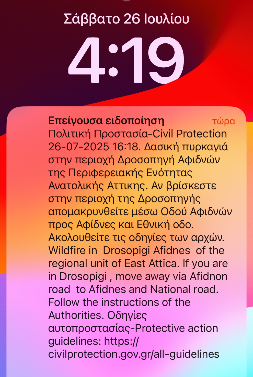 Το 112 έστειλε μήνυμα στους κατοίκους της Δροσοπηγής να απομακρυνθούν προς Αφίδνες λόγω της φωτιάς που μαίνεται στην περιοχή.