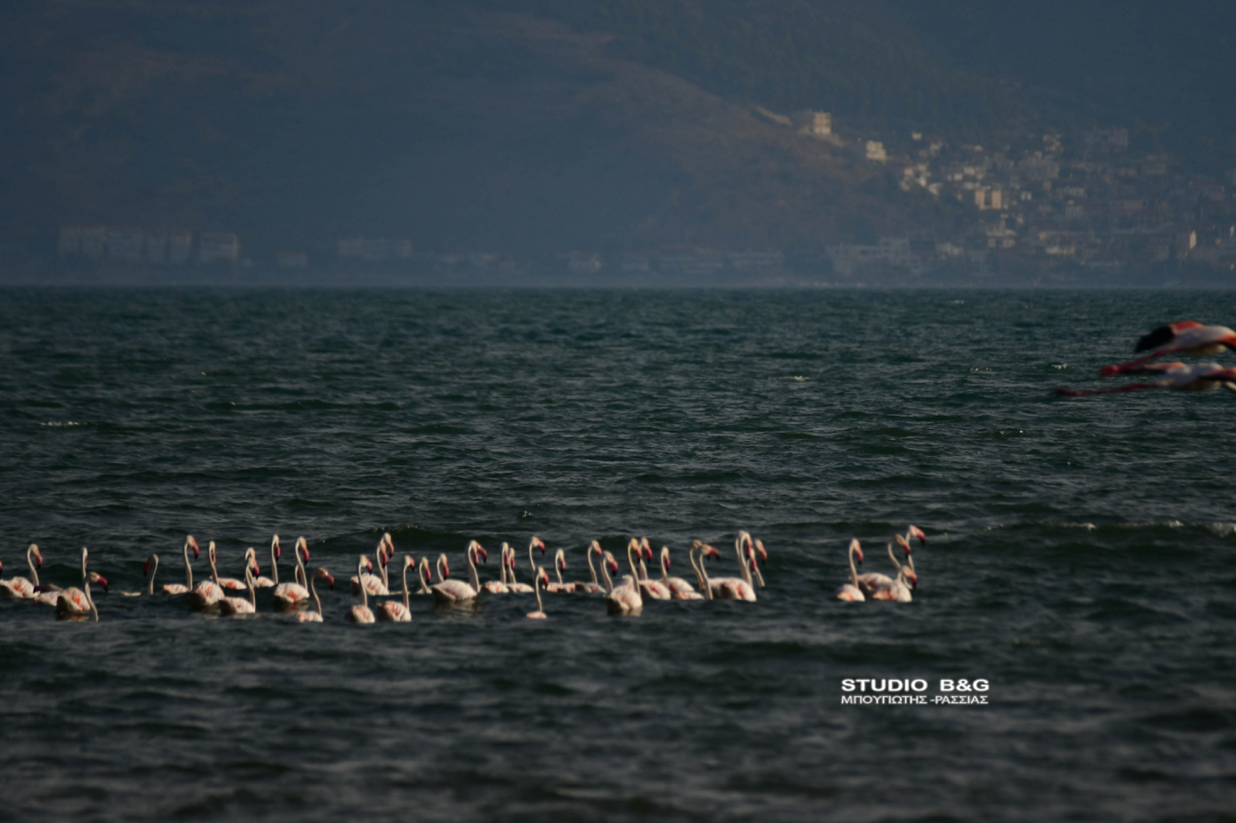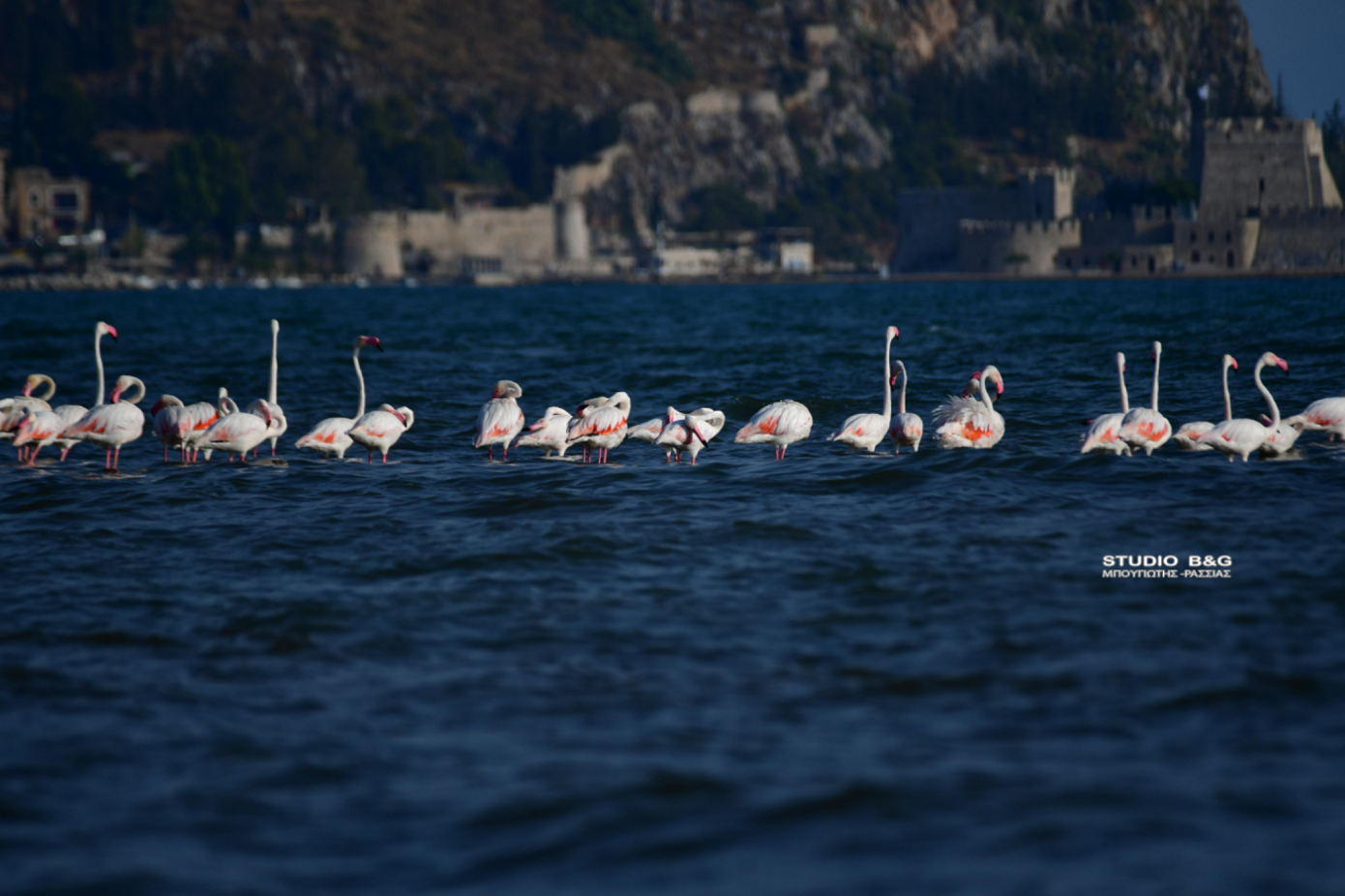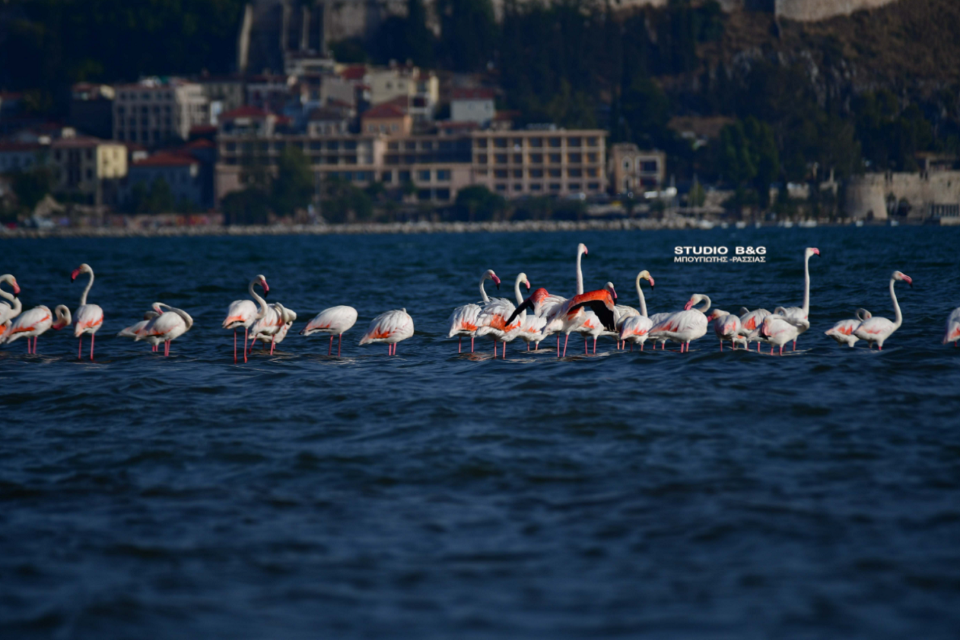 Δεκάδες ροζ φλαμίνγκο εμφανίστηκαν στο Ναύπλιο, προσφέροντας μια σπάνια μαγευτική εικόνα, δημιουργώντας ένα εξωτικό τοπίο απέναντι από το ιστορικό Παλαμήδι, το Μπούρτζι και τον Αργολικό Κόλπο.