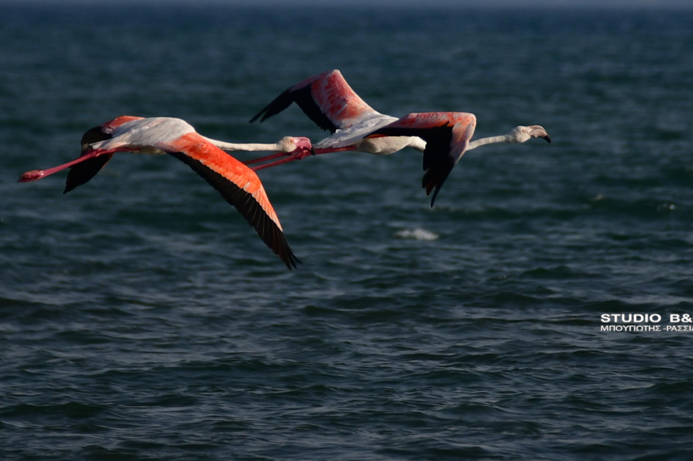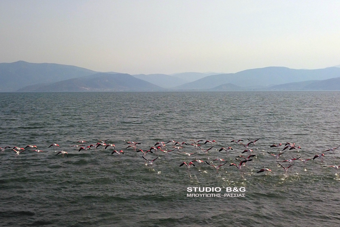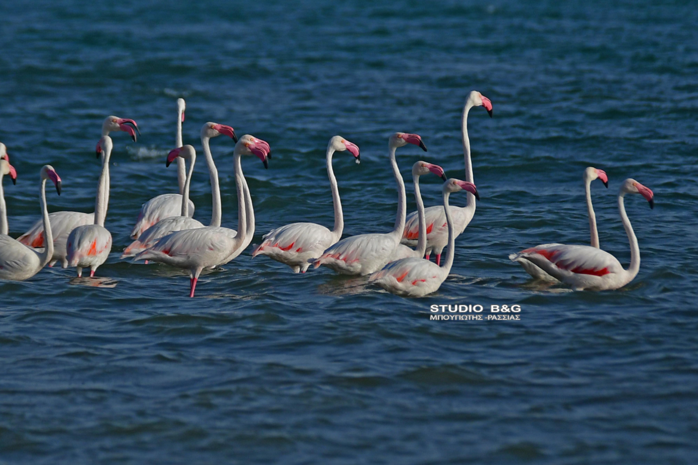 Δεκάδες ροζ φλαμίνγκο εμφανίστηκαν στο Ναύπλιο, προσφέροντας μια σπάνια μαγευτική εικόνα, δημιουργώντας ένα εξωτικό τοπίο απέναντι από το ιστορικό Παλαμήδι, το Μπούρτζι και τον Αργολικό Κόλπο.