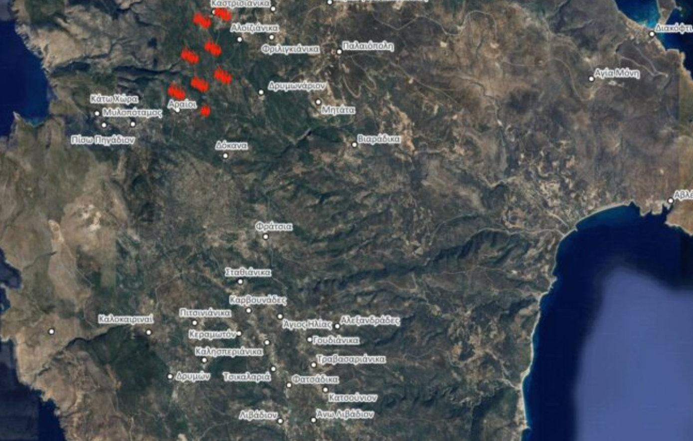 Η εξάπλωση της πυρκαγιάς στο νησί, όπως καταγράφηκε από το Εθνικό Αστεροσκοπείο Αθηνών, απεικονίζεται στον παρακάτω χάρτη.