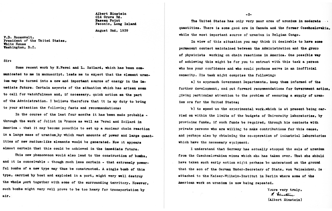 1939: Ο Άλμπερτ Αϊνστάιν και ο Λέο Σίλαρντ στέλνουν επιστολή στον πρόεδρο των ΗΠΑ Φράνκλιν Ρούσβελτ, προειδοποιώντας για τον κίνδυνο να αναπτύξει η ναζιστική Γερμανία πυρηνικά όπλα. Η επιστολή τους, στην οποία περιγράφουν τις δυνατότητες της ατομικής ενέργειας και την ανάγκη να προηγηθεί η Αμερική στην έρευνα, οδηγεί στη δημιουργία του θρυλικού «Σχεδίου Μανχάταν» και σηματοδοτεί την απαρχή της πυρηνικής εποχής, αλλάζοντας ριζικά την ιστορία της τεχνολογίας και του πολέμου.