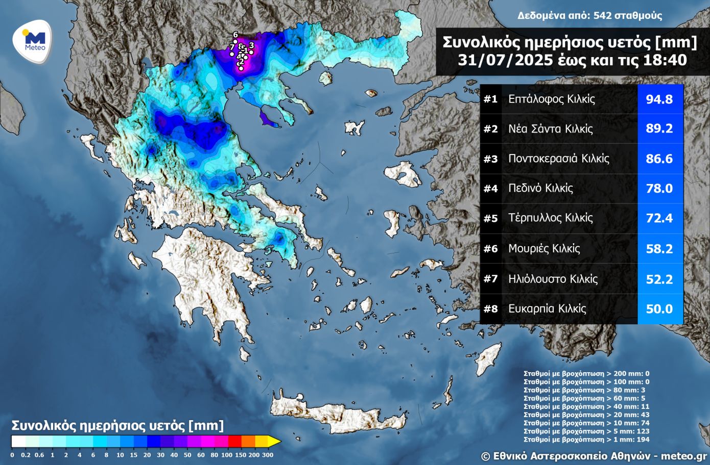 Συγκεκριμένα, τοπικές βροχές και καταιγίδες σημειώθηκαν στα κεντρικά και βόρεια την Πέμπτη 31 Ιουλίου 2025. Σύμφωνα με το δίκτυο αυτόματων μετεωρολογικών σταθμών του Εθνικού Αστεροσκοπείου Αθηνών / meteo.gr, τα πλέον αξιόλογα ύψη βροχής σημειώθηκαν κυρίως σε τμήματα της Μακεδονίας και της Θεσσαλίας, με το μεγαλύτερο ύψος βροχής να καταγράφεται στο μετεωρολογικό σταθμό στον Επτάλοφο Κιλκίς με 94,8 mm. Στον παρακάτω χάρτη παρουσιάζεται η χωρική κατανομή της βροχής έως τις 18:40 της Πέμπτης 31 Ιουλίου 2025 και στον πίνακα τα 8 μεγαλύτερα ύψη βροχής.