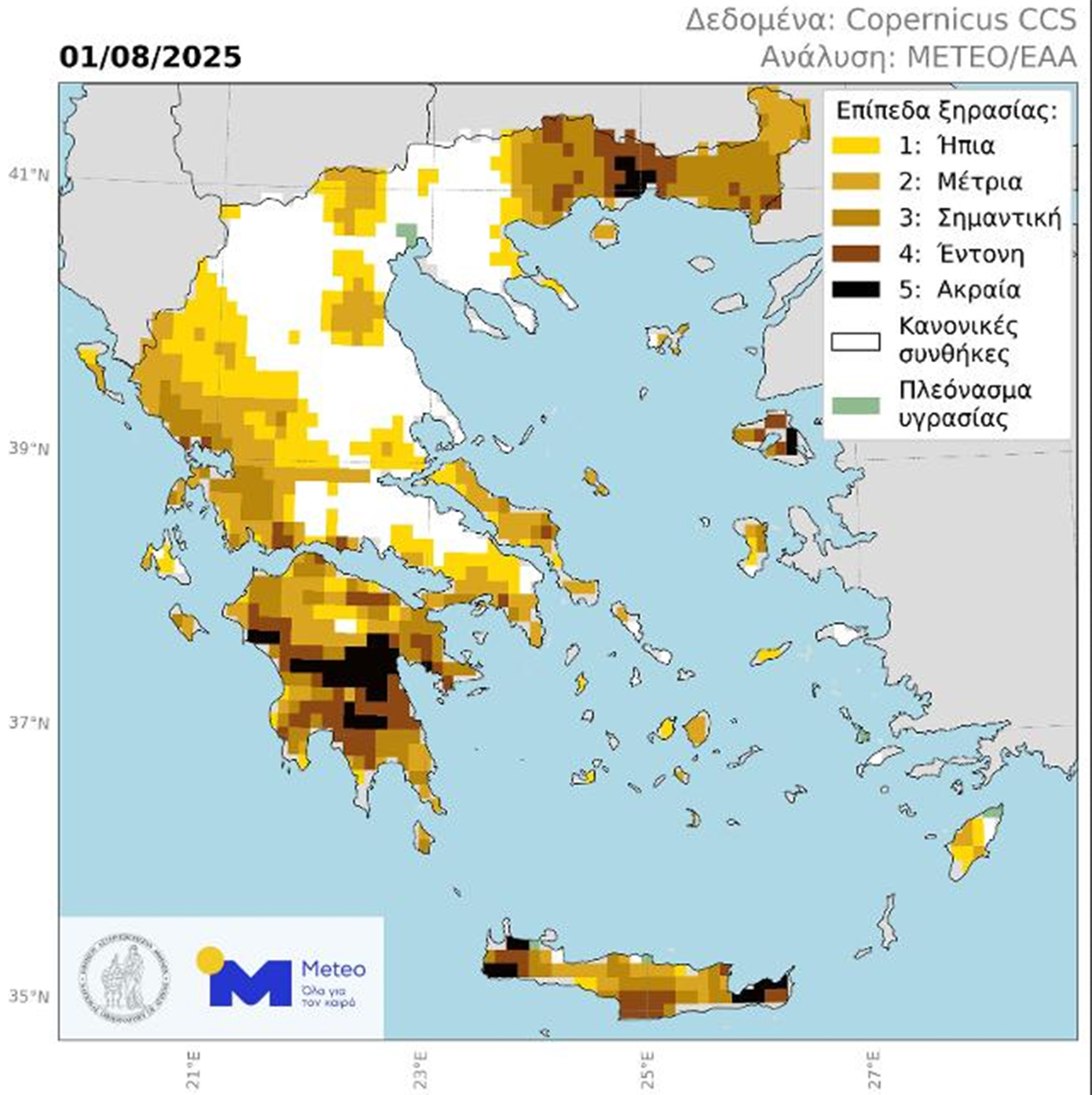 Ανάλυση του meteo του Εθνικού Αστεροσκοπείου Αθηνών, καταγράφει τον δείκτη ξηρασίας στην Ελλάδα την 1η Αυγούστου 2025.