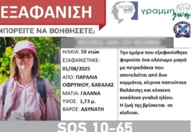 Συνεχίζεται με αμείωτη ένταση η αγωνία για την τύχη της 59χρονης Βρετανίδας τουρίστριας, Μισέλ Μπουρντά, η οποία εξαφανίστηκε μυστηριωδώς το μεσημέρι της Παρασκευής 1η Αυγούστου από την παραλία Οφρυνίου στην Καβάλα. Παρά τις έρευνες των Αρχών και την ενεργοποίηση του Silver Alert, τα ίχνη της γυναίκας παραμένουν άφαντα.