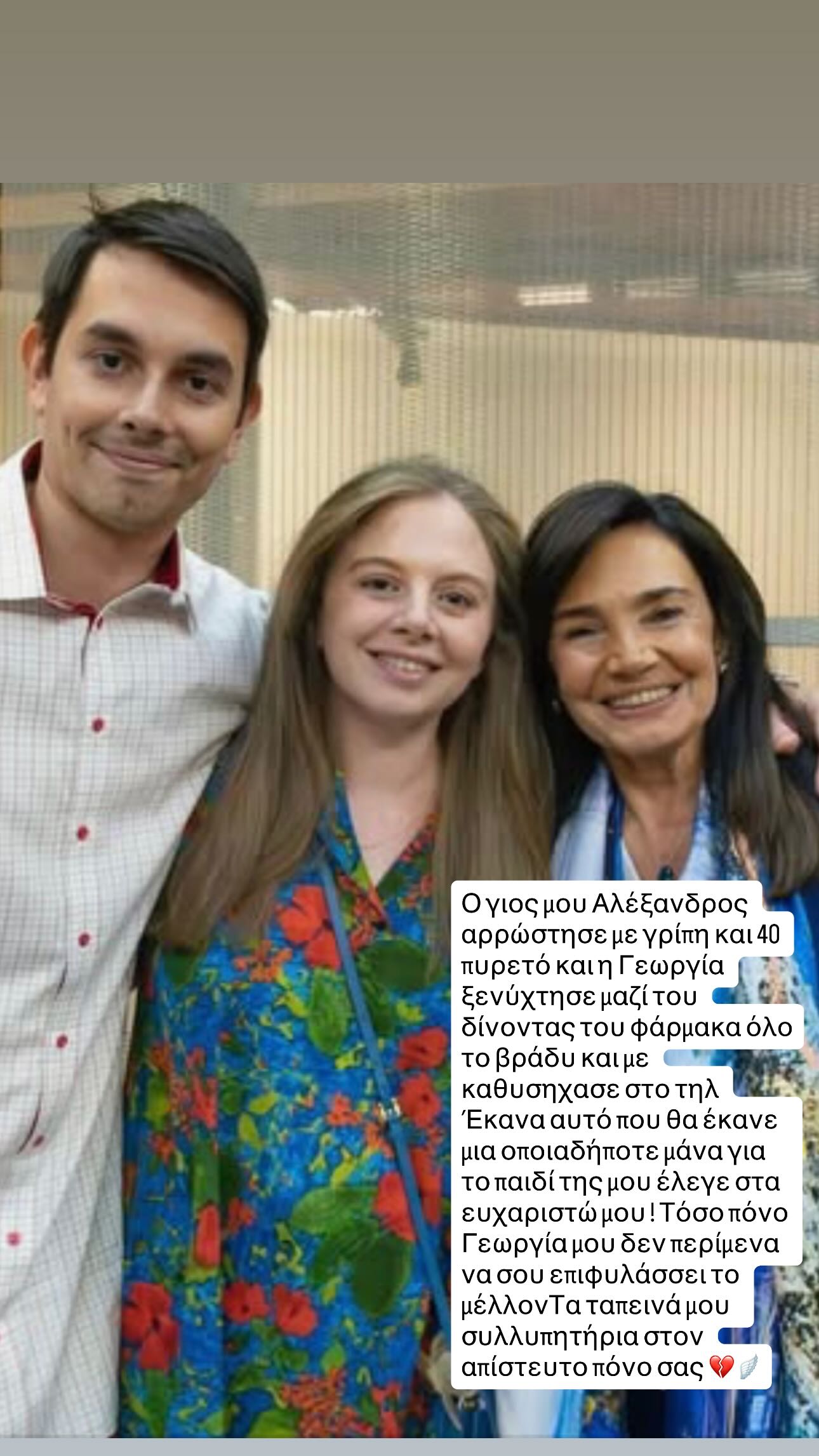 Ο γιος μου Αλέξανδρος αρρώστησε με γρίπη και 40 πυρετό και η Γεωργία ξενύχτησε μαζί του δίνοντάς του φάρμακα όλο το βράδυ και με καθησύχασε στο τηλέφωνο. Έκανα αυτό που θα έκανε μια οποιαδήποτε μάνα για το παιδί της, μου έλεγε “στα ευχαριστώ μου”! Τόσο πόνο, Γεωργία μου, δεν περίμενα να σου επιφυλάσσει το μέλλον. Τα ταπεινά μου συλλυπητήρια στον απίστευτο πόνο σας»