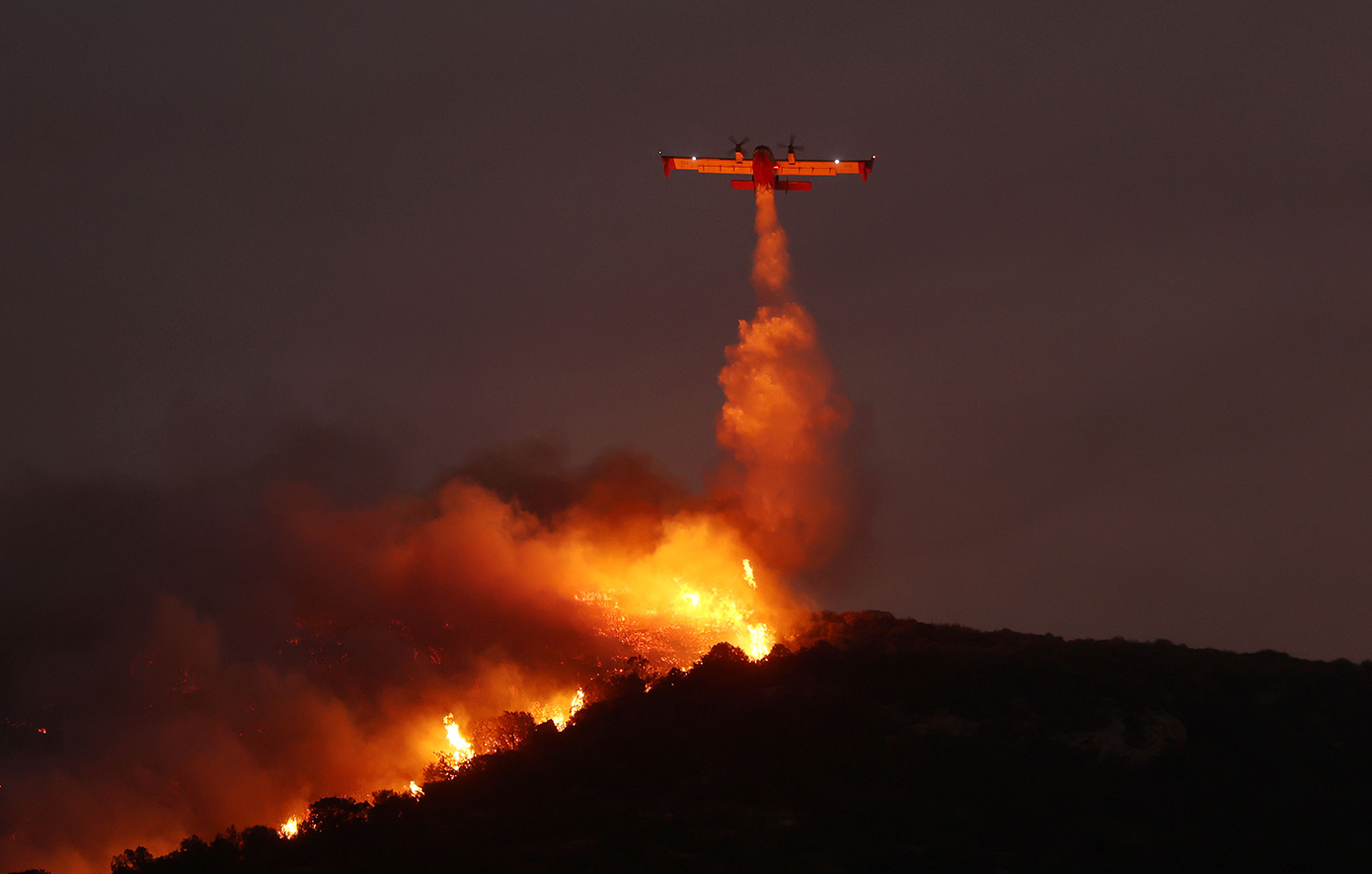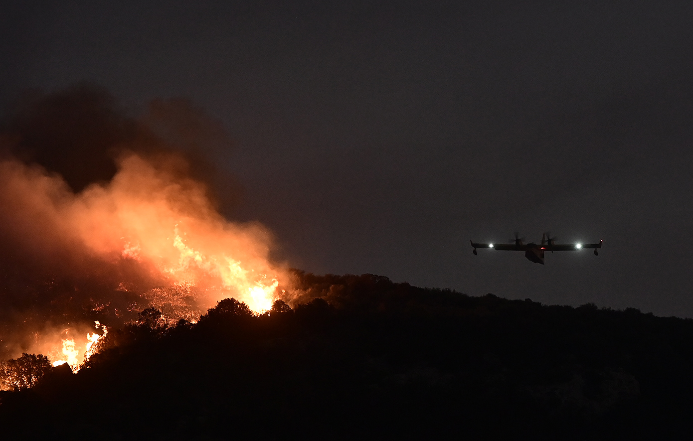 Με τα φώτα πτήσης αναμμένα, για να διακρίνονται μεταξύ τους μέσα στον πυκνό καπνό, τα πληρώματα των αεροσκαφών πραγματοποίησαν τις τελευταίες ρίψεις νερού στο σκοτάδι, σε μια προσπάθεια να επιβραδύνουν την εξάπλωση της φωτιάς.