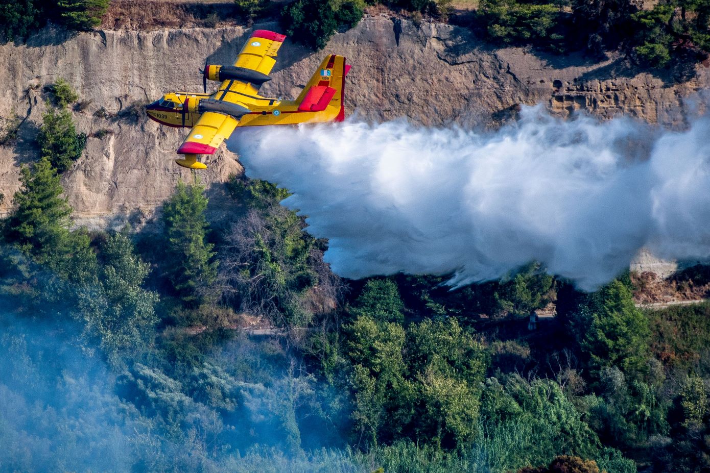 Με τα φώτα πτήσης αναμμένα για να διακρίνονται μέσα από τον πυκνό καπνό, οι πιλότοι των Canadair συνέχισαν τις ρίψεις νερού ακόμη και μετά τη δύση του ήλιου, επιχειρώντας να περιορίσουν την πυρκαγιά που έκαιγε σε ευθεία πέντε χιλιομέτρων. Συγκλονιστικά είναι τα πλάνα που καταγράφουν τις ρίψεις στην περιοχή της Κερατέας.