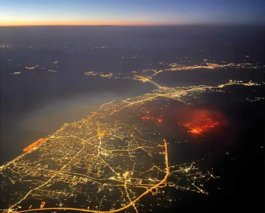 Στο στιγμιότυπο φαίνεται η πόλη φωτισμένη, ενώ σε μικρή απόσταση ξεχωρίζουν τα πύρινα μέτωπα που κατακαίνε ανεξέλεγκτα την περιοχή. Προς την Αρόη, μία συνεχόμενη γραμμή φλόγας «αγκαλιάζει» το τοπίο, ενώ στο Ρωμανό η φωτιά φουντώνει με ένταση. Στον ορίζοντα, διάσπαρτες μικρότερες εστίες θυμίζουν αναμμένα καντηλάκια, μαρτυρώντας το πόσο επικίνδυνες και πολυάριθμες είναι οι αναζωπυρώσεις.