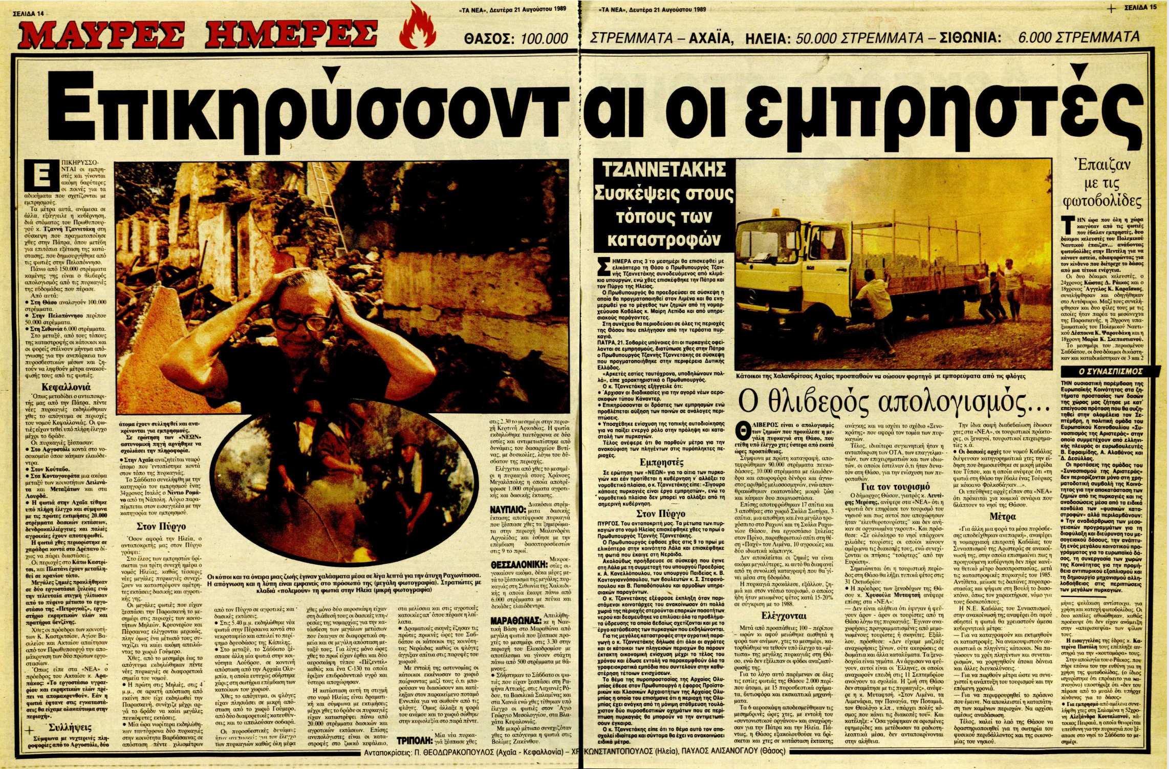 1989: Τεράστια πυρκαγιά στη Θάσο καταστρέφει περισσότερα από 80.000 στρέμματα, ενώ οι φλόγες φτάνουν μέχρι το λιμάνι. Το νησί πλήττεται από ανυπολόγιστη οικολογική ζημιά.