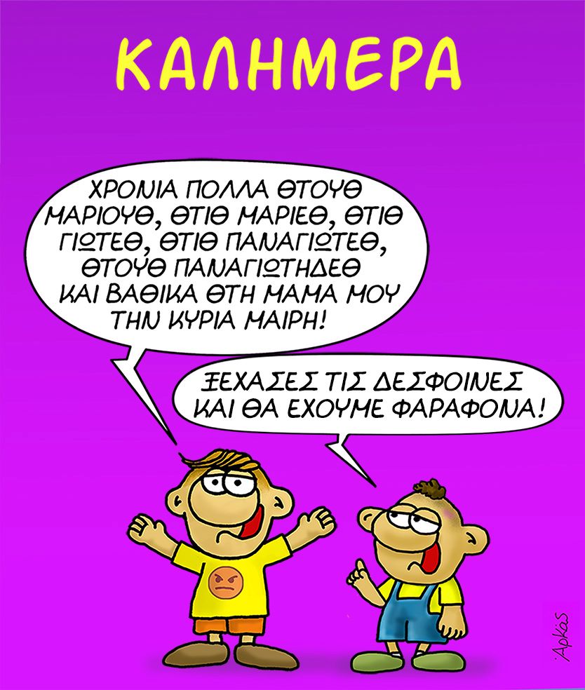 Ο σκιτσογράφος μέσω δύο αγαπημένων χαρακτήρων στέλνει ονομαστικά ευχές στους εορτάζοντες, έστω και με κάποιες… γλωσσικές ιδιαιτερότητες, προειδοποιώντας, πάντως για πιθανές παρεξηγήσεις.