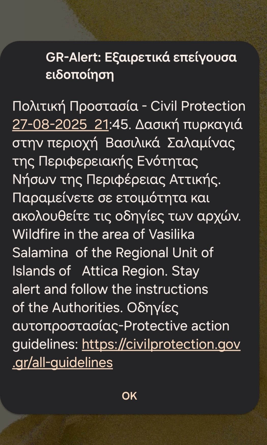 Μάλιστα, στις 21:45 ήχησε το 112 καλώντας τους κατοίκους της περιοχής Βασιλικά Σαλαμίνας να παραμείνουν σε ετοιμότητα.