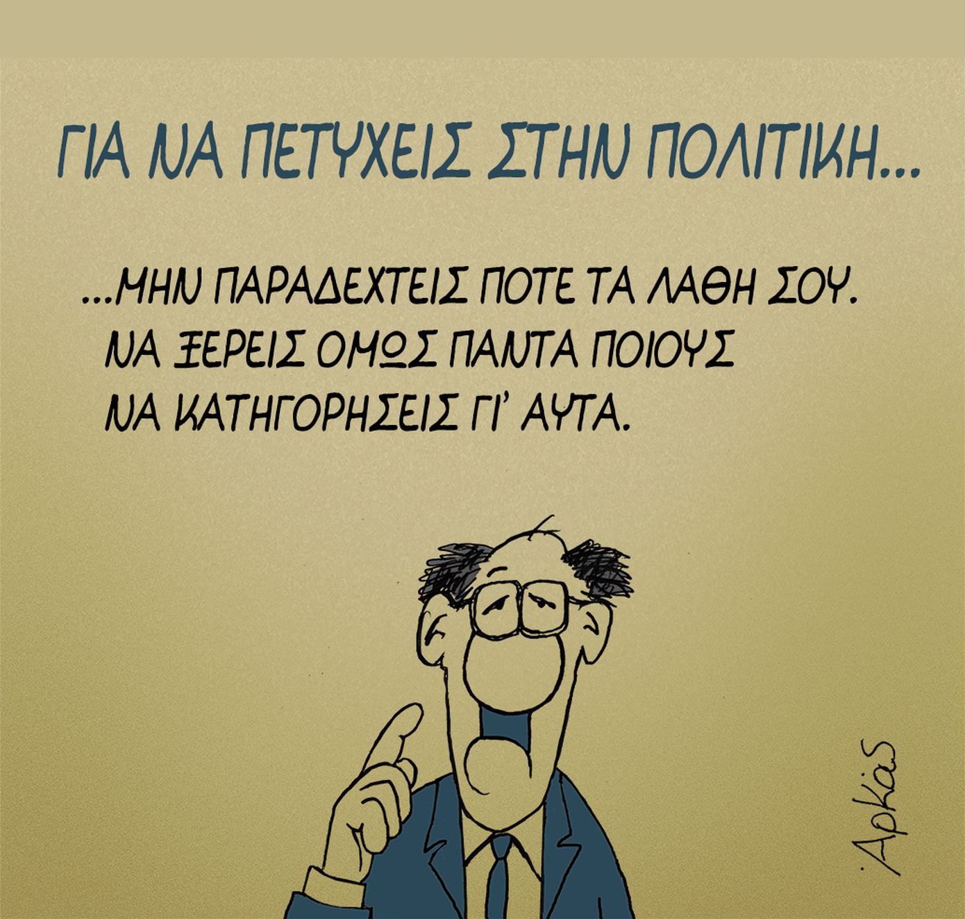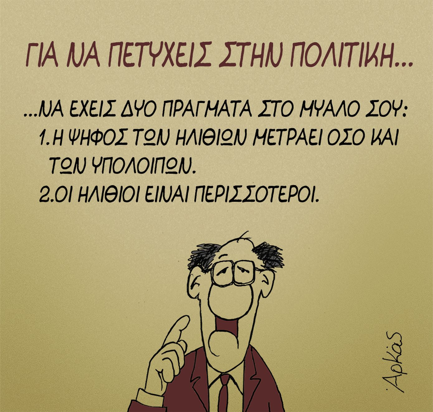 Μέσα από τα σκίτσα του ο Αρκάς προσπαθεί να καθοδηγήσει όσους επιθυμούν να ασχοληθούν με την πολιτική τονίζοντας μεταξύ άλλων: «Η ψήφος των ηλίθιων μετράει όσο και των υπολοίπων» και διευκρινίζοντας πως «οι ηλίθιοι είναι περισσότεροι».