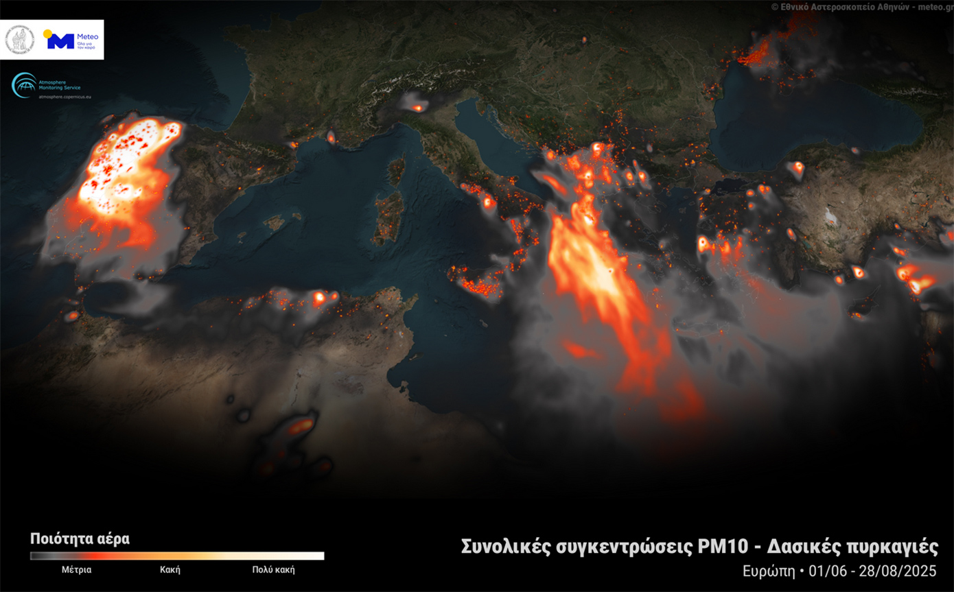 Όπως φαίνεται στη σχετική εικόνα, οι υψηλότερες συγκεντρώσεις αιωρούμενων σωματιδίων PM₁₀ (σωματίδια με διάμετρο μικρότερη των 10 μικρομέτρων), τα οποία συνδέονται με τις δασικές πυρκαγιές, καταγράφηκαν στην Ισπανία, την Πορτογαλία και τον ελλαδικό χώρο. Οι εκτεταμένες πυρκαγιές που ξέσπασαν φέτος συνέβαλαν καθοριστικά στην επιβάρυνση της ατμόσφαιρας, αυξάνοντας τον κίνδυνο για τη δημόσια υγεία.