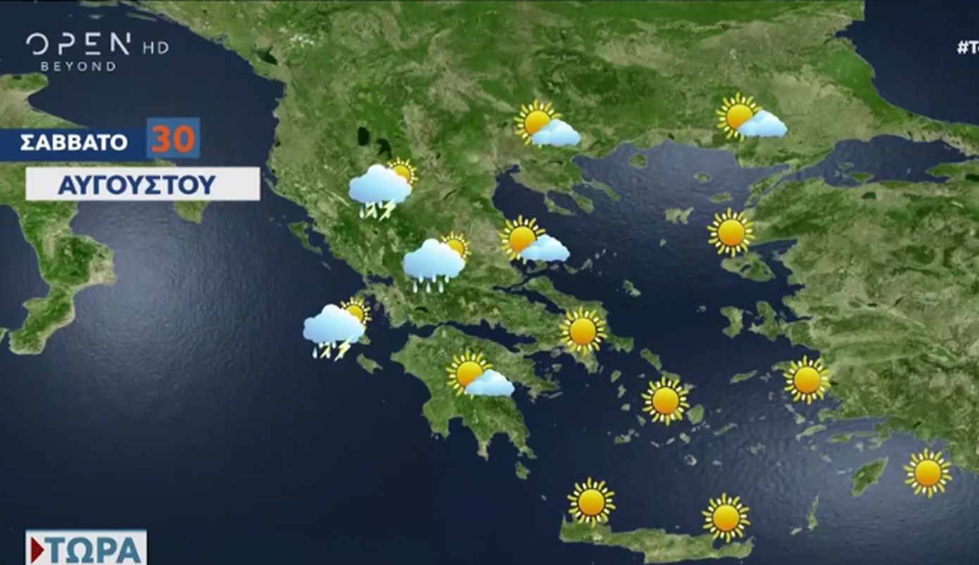 Η χώρα χωρίζεται ουσιαστικά σε δύο τμήματα από το μεσημέρι-απόγευμα και στη συνέχεια: από τη μία στη δυτική και βόρεια χώρα από το μεσημέρι ο καιρός θα γίνει πιο φθινοπωρινός. Προσοχή σε βόρειο Ιόνιο, Ήπειρο, δυτική Μακεδονία, πιθανόν και δυτική Στερεά, όπου μπορεί να σημειωθούν έντονες βροχές και καταιγίδες. Πάντως, ο καλοκαιρινός καιρός θα επικρατήσει στα ανατολικά και νότια με ηλιοφάνεια.