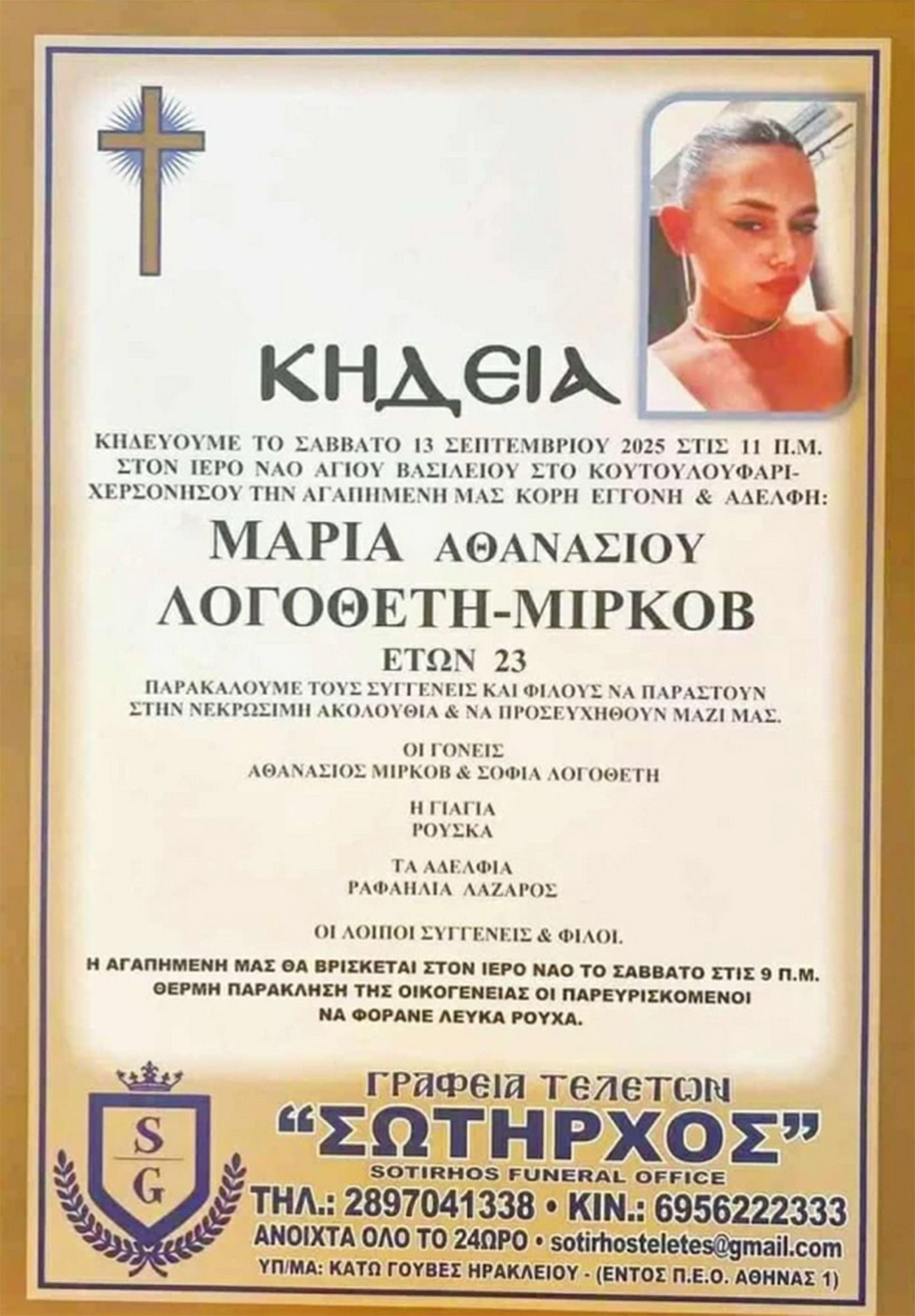 Το Σάββατο θα πραγματοποιηθεί η κηδεία της 23χρονης Μαρίας που έχασε τη ζωή της σε τροχαίο στην Κρήτη.