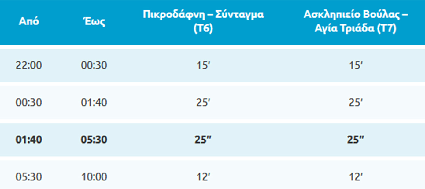 Συχνότητες διέλευσης γραμμών Τ6 και Τ7 του Τραμ κάθε Σάββατο από 22:00 έως 10:00