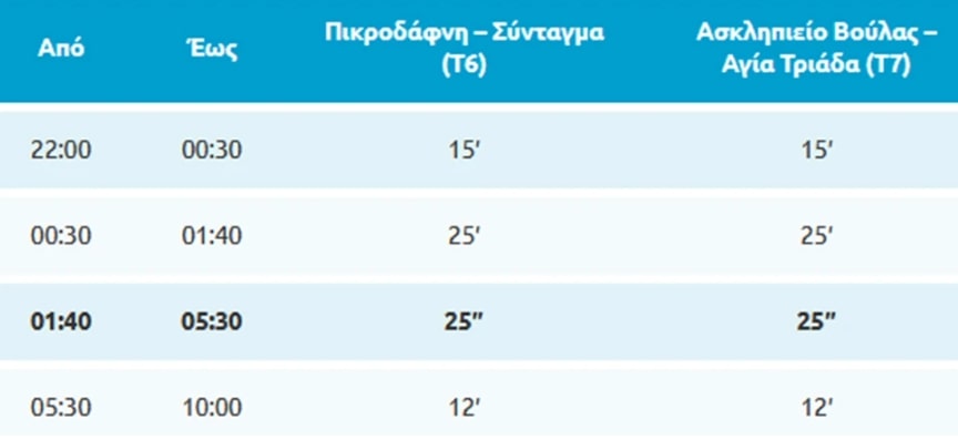 Συχνότητες διέλευσης γραμμών Τ6 και Τ7 του τραμ κάθε Σάββατο από 22:00 έως 10:00