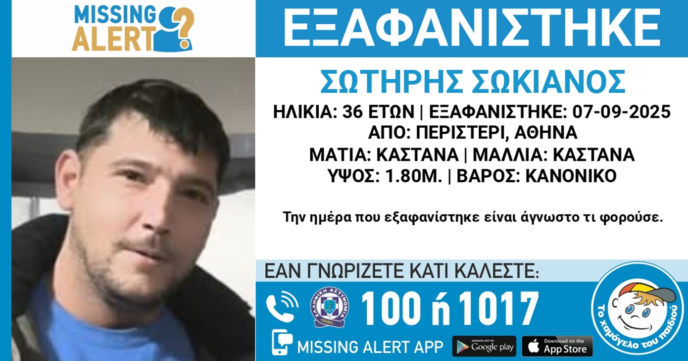 Το «Χαμόγελο του Παιδιού» ενημερώθηκε για την εξαφάνιση του Σωτήρη Σωκιανού, στις 14/09/2025 και προχώρησε στη δημοσιοποίηση των στοιχείων του ενήλικου κατόπιν αιτήματος των οικείων του καθώς ενδέχεται να συντρέχουν λόγοι, οι οποίοι θέτουν τη ζωή του σε κίνδυνο.