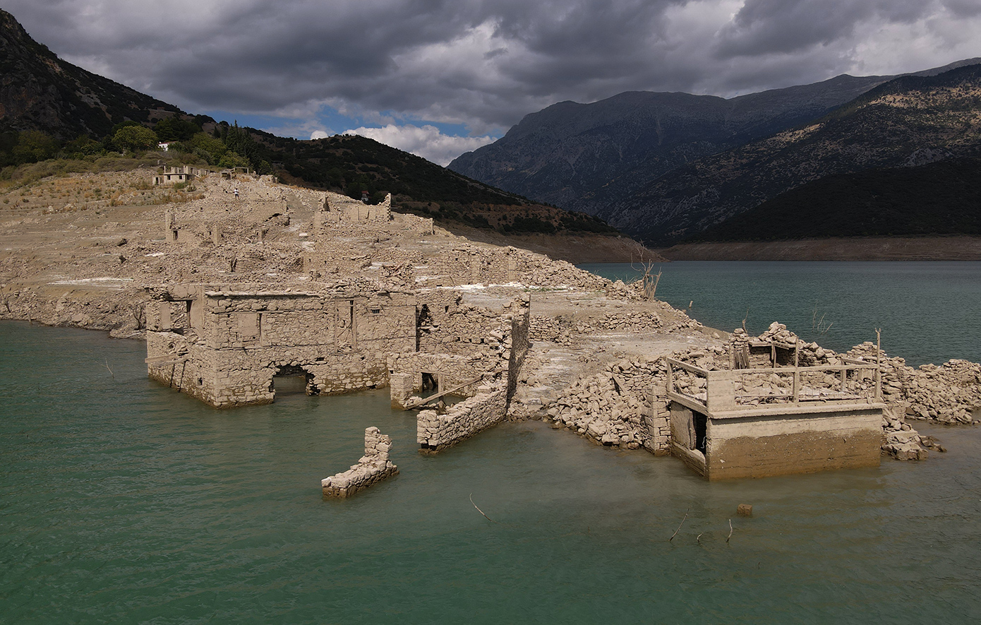 Αναδύθηκε το βυθισμένο χωριό Κάλλιο στη Δωρίδα από τα νερά της τεχνητής λίμνης του Μόρνου, καθώς η στάθμη συνεχίζει να υποχωρεί επικίνδυνα λόγω της παρατεταμένης λειψυδρίας.