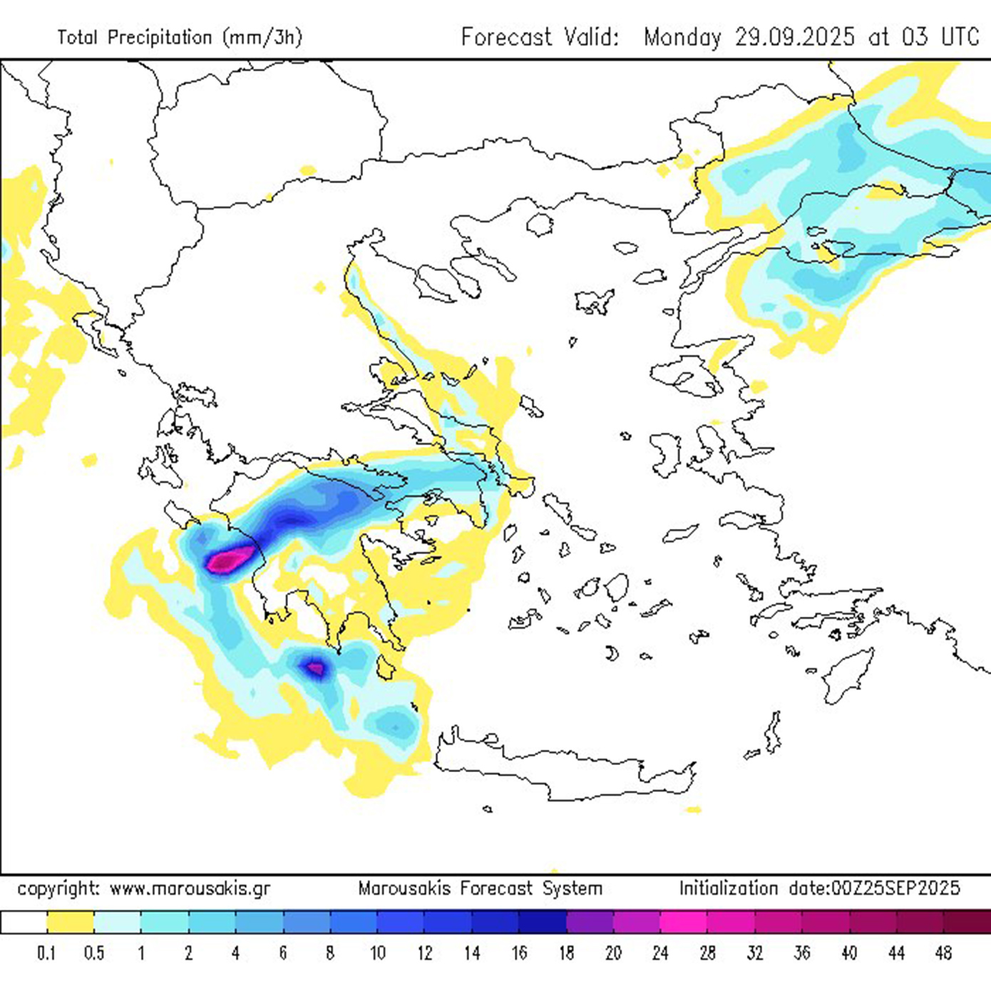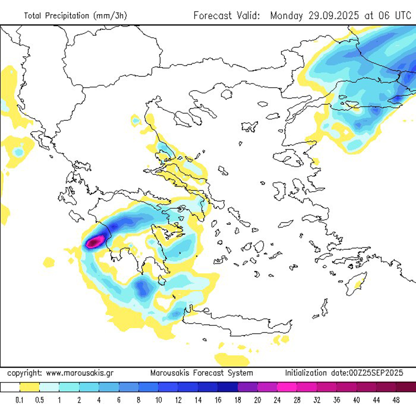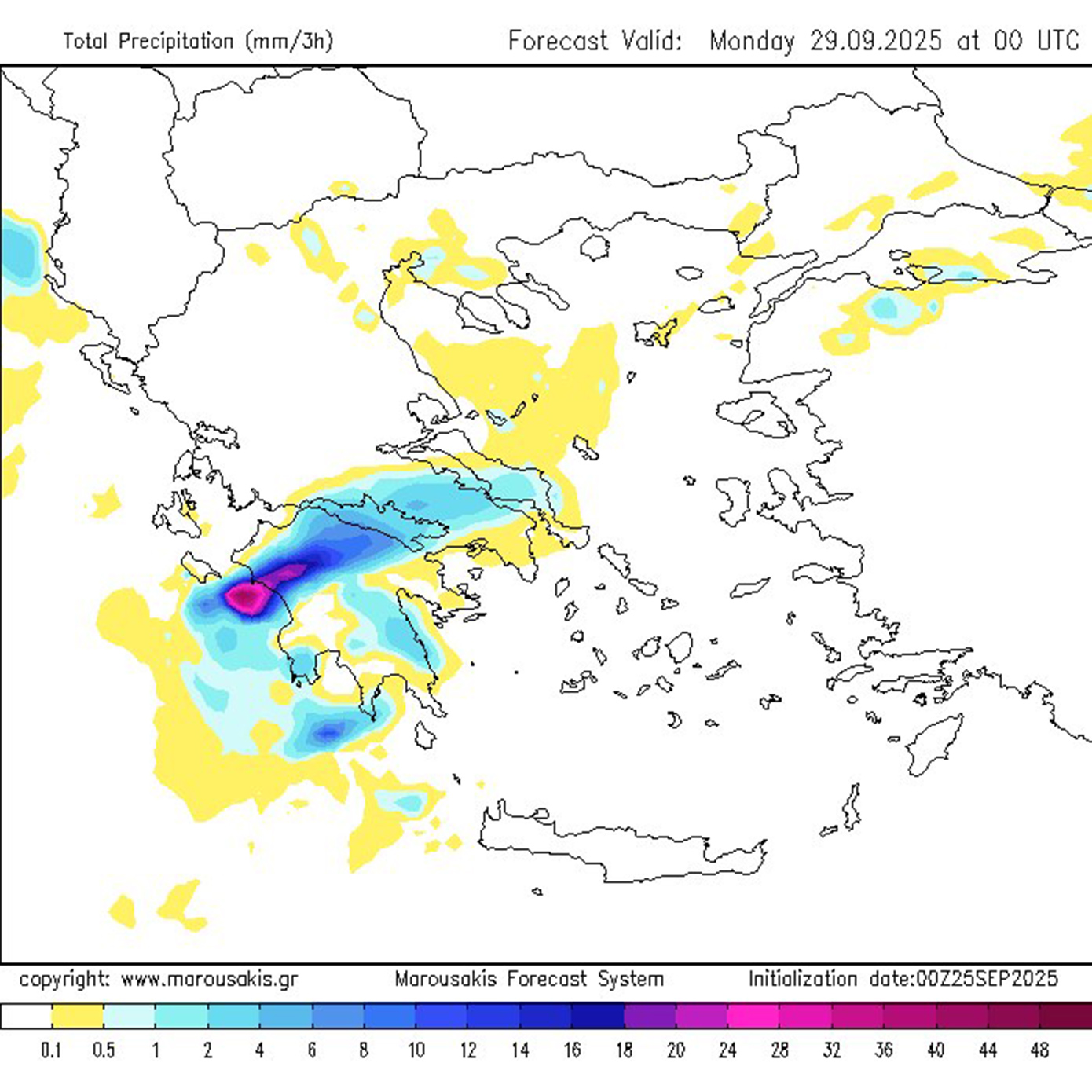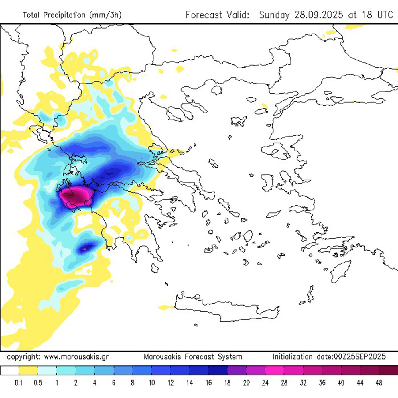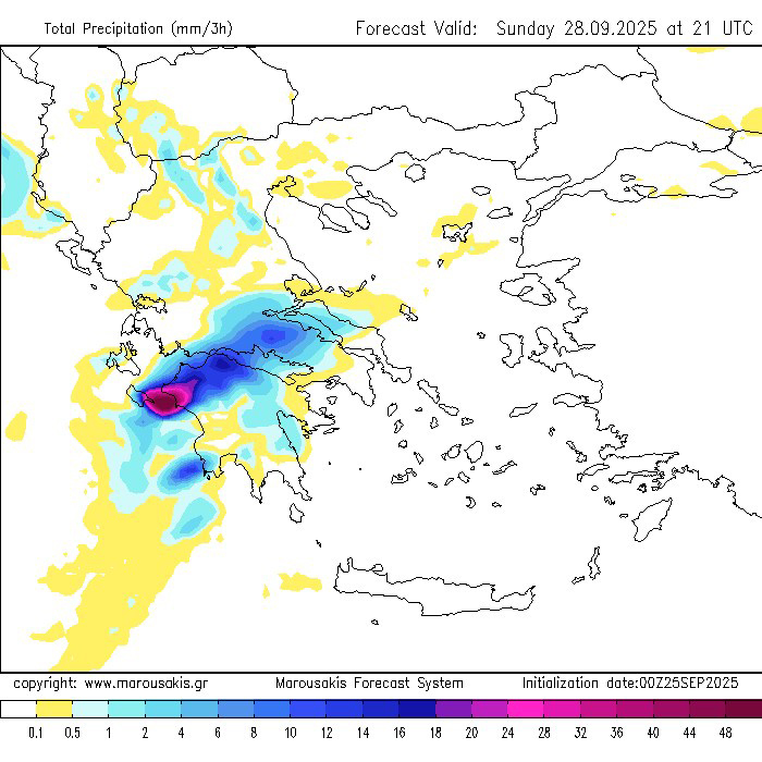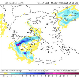 Αυτό σημαίνει ότι σε πολλές περιοχές δυτικά της οροσειράς της Πίνδου θα αναπτυχθούν πολύωρες ανατροφοδοτούμενες καταιγίδες οι οποίες είναι σε θέση να δώσουν εξαιρετικά μεγάλα ύψη βροχής. - Ανησυχητικό είναι το γεγονός ότι οι καταιγίδες θα δραστηριοποιηθούν για πολλές ώρες ανατροφοδοτούμενες συνεχώς από τις εκεί θαλάσσιες εκτάσεις μη μπορώντας να εκτονωθούν ανατολικότερα εξαιτίας και της βαρομετρικής διάταξης που αναμένεται να διαμορφωθεί (εκτιμώμενη διάρκεια μεγαλύτερη των 24 ωρών).