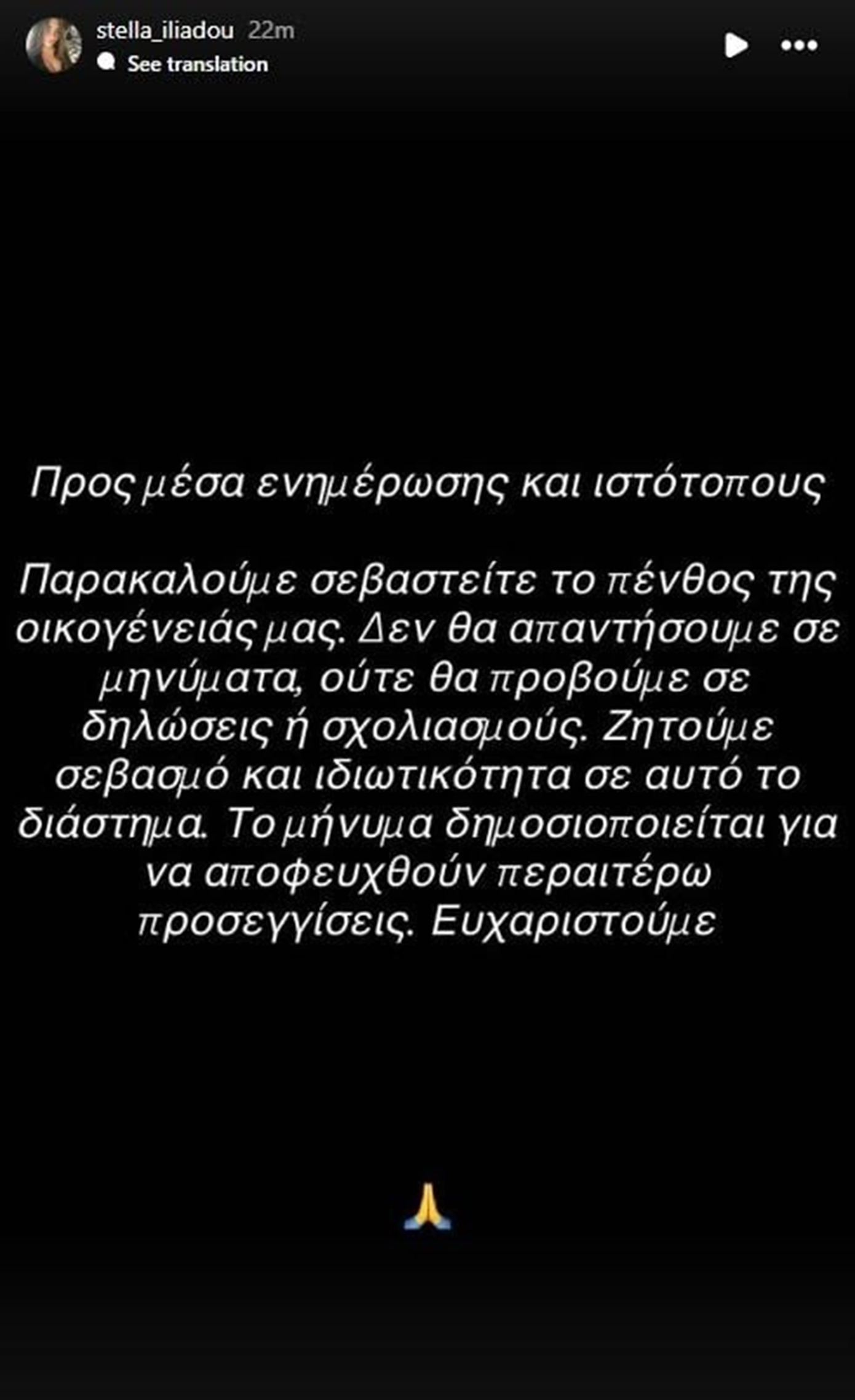 «Προς μέσα και ιστότοπους, παρακαλούμε σεβαστείτε το πένθος της οικογένειάς μας. Δεν θα απαντήσουμε σε μηνύματα, ούτε θα προβούμε σε δηλώσεις ή σχολιασμούς. Ζητούμε σεβασμό και ιδιωτικότητα σε αυτό το διάστημα. Το μήνυμα δημοσιοποιείται για να αποφευχθούν περαιτέρω προσεγγίσεις. Ευχαριστούμε», αναφέρει χαρακτηριστικά