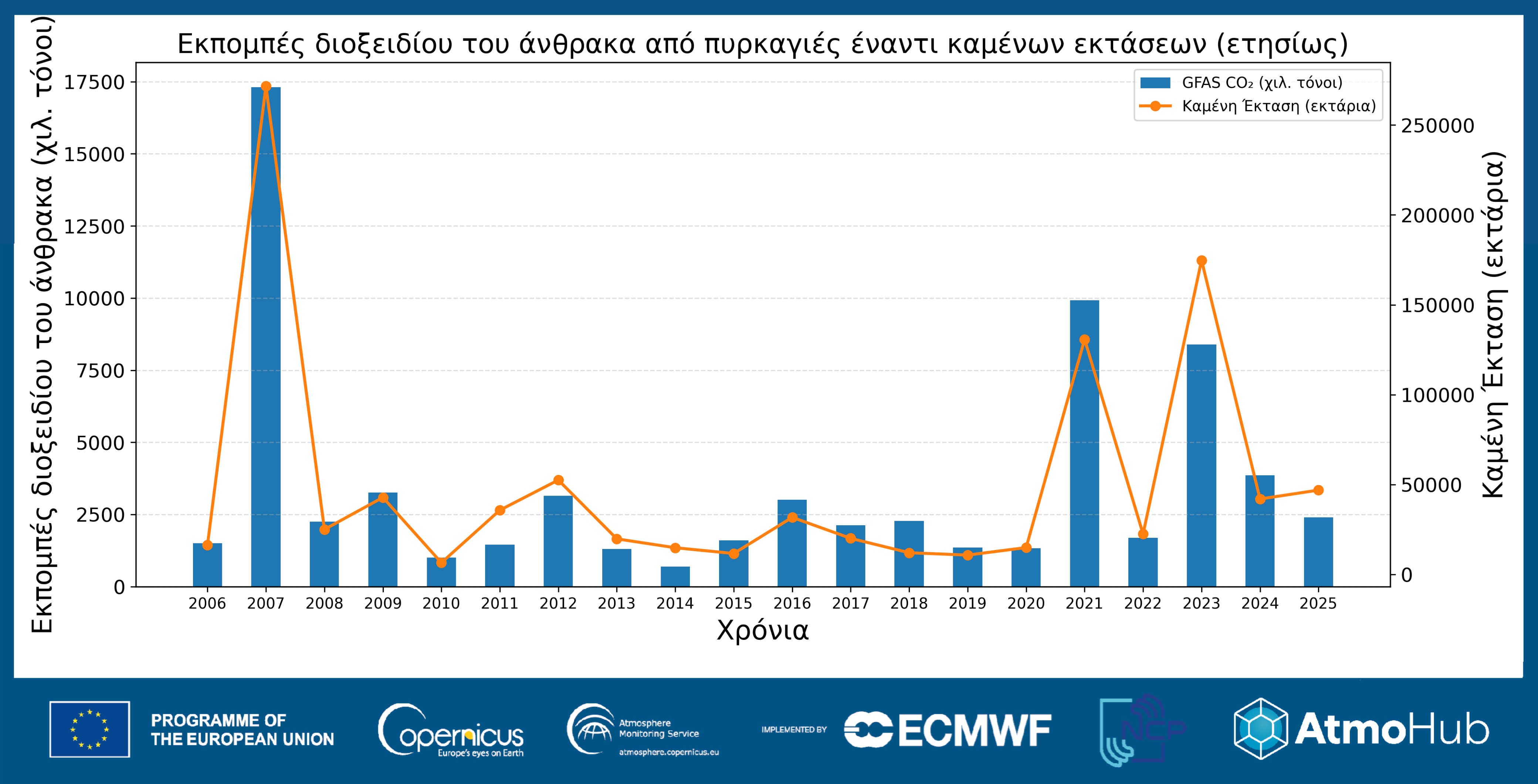 Ειδικότερα, όσον αφορά τις εκπομπές δασικών πυρκαγιών στην Ελλάδα, σε γράφημα (Γράφημα 1) παρουσιάζονται οι συνολικές ετήσιες εκπομπές διοξειδίου του άνθρακα (CO2) από πυρκαγιές για την Ελλάδα, με χρήση των δεδομένων του Παγκόσμιου Συστήματος Αφομοίωσης Πυρκαγιών (GFAS) του CAMS (μπλε ράβδοι), καθώς και οι ετήσιες ανθρωπογενείς εκπομπές διοξειδίου του άνθρακα στην χώρα, στα πλαίσια της εθνικής απογραφής εκπομπών διοξειδίου του άνθρακα (πορτοκαλί ράβδοι, εξαιρούνται οι εκπομπές από Χρήση Γης, Αλλαγών Χρήσεων Γης και Δασοπονίας – LULUCF).
