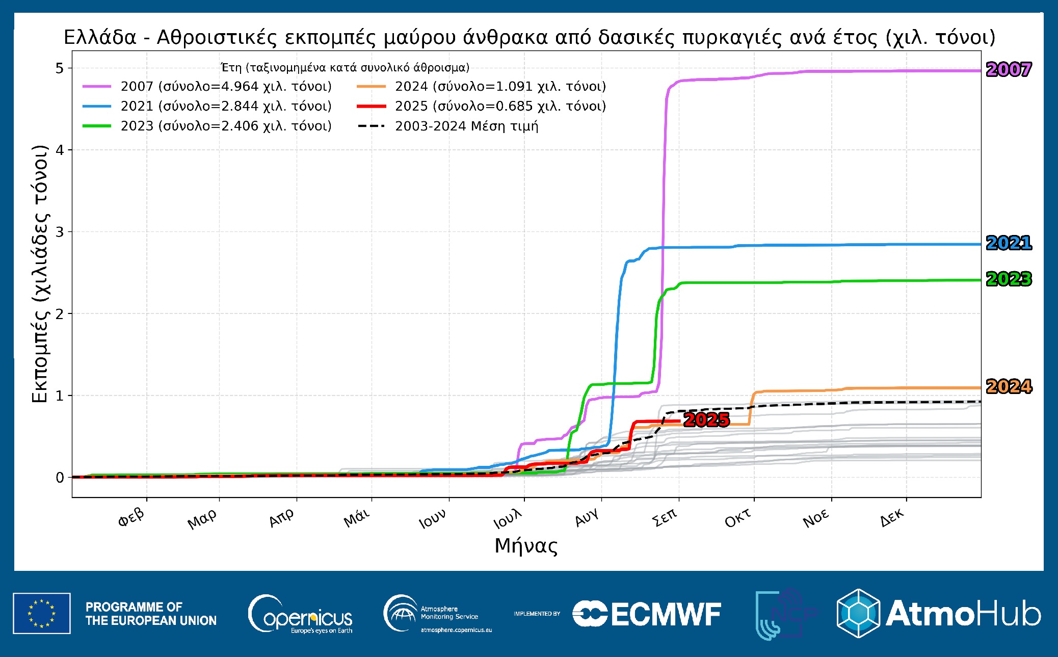 «Για το έτος 2025 (κόκκινη γραμμή), από την αρχή του έτους μέχρι τα τέλη Αυγούστου, οι εκπομπές μαύρου άνθρακα στην Ελλάδα έφτασαν τους 685 τόνους, ακολουθώντας τον μέσο όρο των ετών 2003-2024 (μαύρη διακεκομμένη γραμμή). Τις τρεις πρώτες θέσεις με τις μεγαλύτερες εκπομπές μαύρου άνθρακα στην χώρα μας καταλαμβάνουν τα έτη 2007 (~4,960 τόνους), 2021 (~2,844 τόνους) και 2023 (~2,406 τόνους)», υπογραμμίζει η ομάδα.