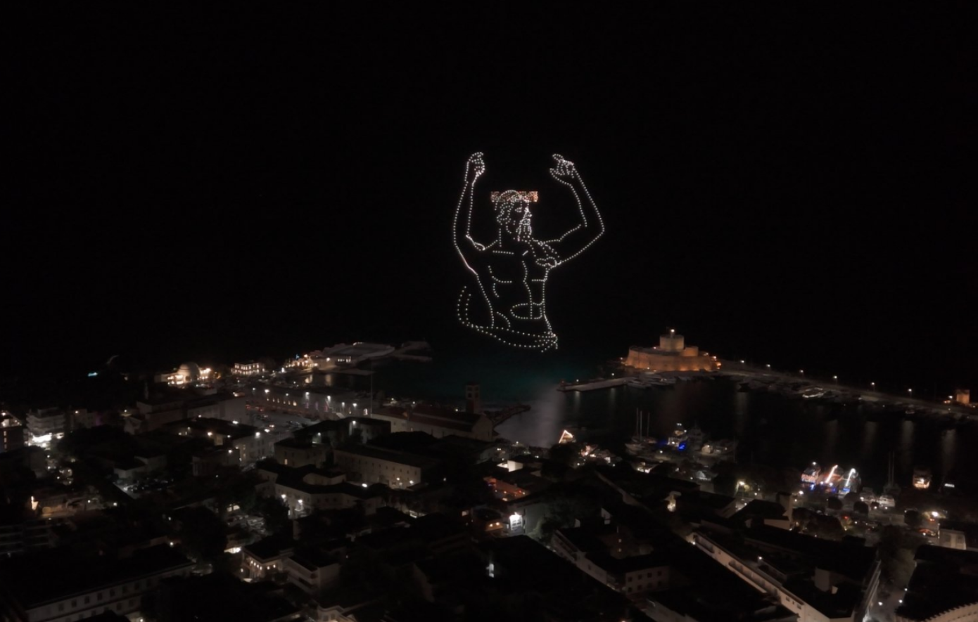 Ο ουρανός του νησιού μετατράπηκε σε έναν ζωντανό καμβά, όπου 1.000 drones πραγματοποίησαν ένα ανεπανάληπτο σόου φωτός, ταξιδεύοντας τους θεατές μέσα στους αιώνες της ρόδιας ιστορίας.