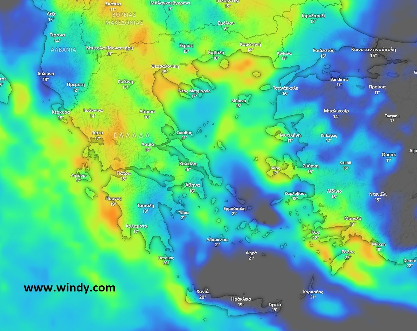Οι άνεμοι στα δυτικά θα πνέουν αρχικά νότιοι-νοτιοανατολικοί 4 με 6 μποφόρ και μετά το μεσημέρι βόρειοι-βορειοδυτικοί στο βόρειο Ιόνιο τοπικά 7 μποφόρ. Στα ανατολικά οι άνεμοι θα πνέουν αρχικά βορειοδυτικοί 3 με 4 και βαθμιαία νότιοι 4 με 6, ενώ στο βόρειο Αιγαίο θα είναι ανατολικοί 5 με 6 μποφόρ.