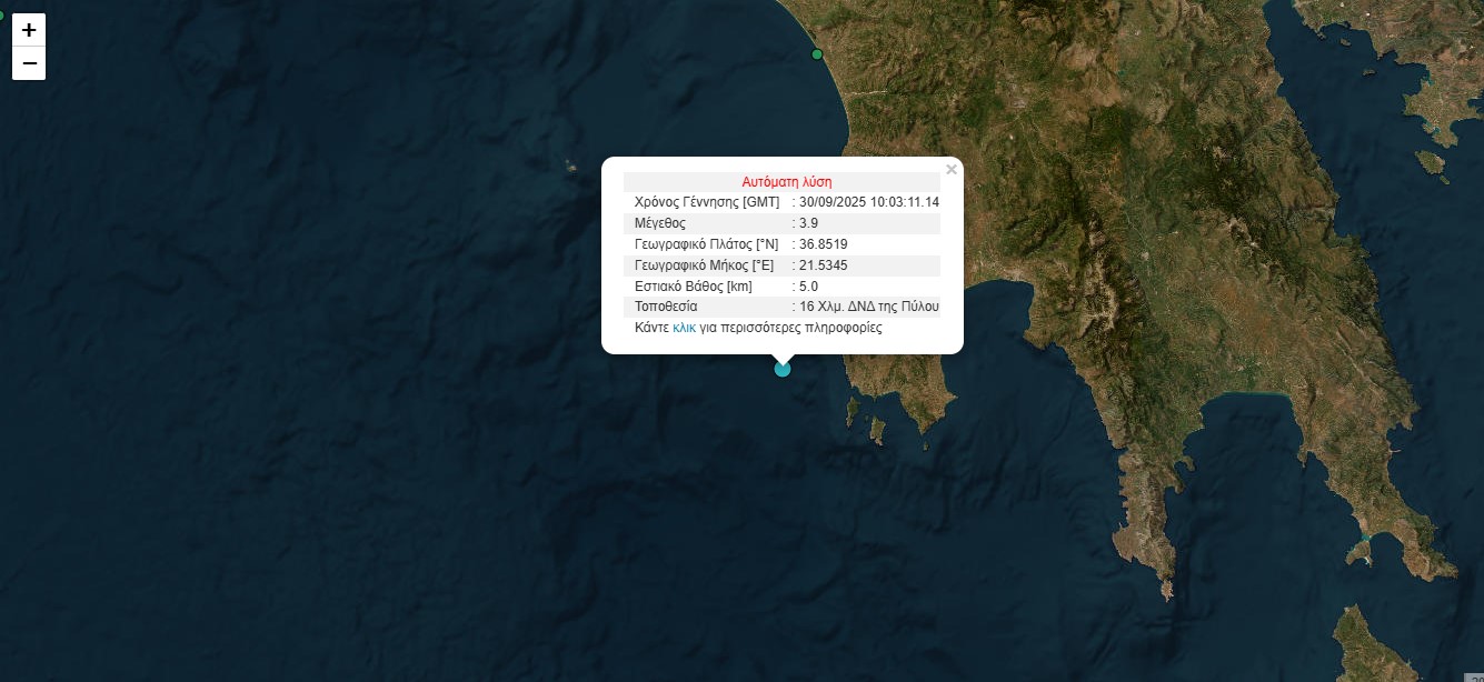 Σύμφωνα με τις αρχικές μετρήσεις του Γεωδυναμικού Ινστιτούτου, η δόνηση καταγράφηκε στις 13:03, σε επίκεντρο 16 Χλμ. δυτικά-νοτιοδυτικά της Πύλου, σε θαλάσσιο χώρο και σε εστιακό βάθος 5 χλμ.