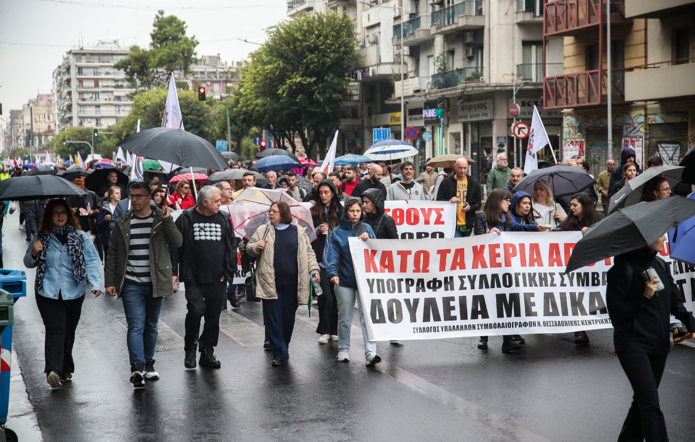 «Σήμερα δίνουμε μια μεγάλη απεργιακή απάντηση μετά το μεγάλο συλλαλητήριο των σωματείων στη ΔΕΘ, σε κυβέρνηση, αστικά κόμματα και εργοδοσία! Το νομοσχέδιο σας για 13 ώρες δουλειά είναι για τα σκουπίδια. Εκεί θα το στείλουμε! Δεν θα επιτρέψουμε να περάσει πουθενά. Σε κανένα εργοστάσιο σε κανένα σουπερμάρκετ, σε κανένα εργοτάξιο, σε καμία υπηρεσία! Θα το ακυρώσουν οι εργαζόμενοι με τα σωματεία τους! Γιατί μέσα από τα σωματεία και τις Συλλογικές αποφάσεις και δράσεις, οι εργαζόμενοι σε όλους τους κλάδους απαιτούν: ΣΣΕ, 7ωρο 5ήμερο 35ωρο με πραγματικές αυξήσεις στους μισθούς», τόνισε στην ομιλία του, στη συγκέντρωση του ΠΑΜΕ, ο πρόεδρος της Ένωσης εμποροϋπαλλήλων Θεσσαλονίκης Δημήτρης Μπελόπουλος.