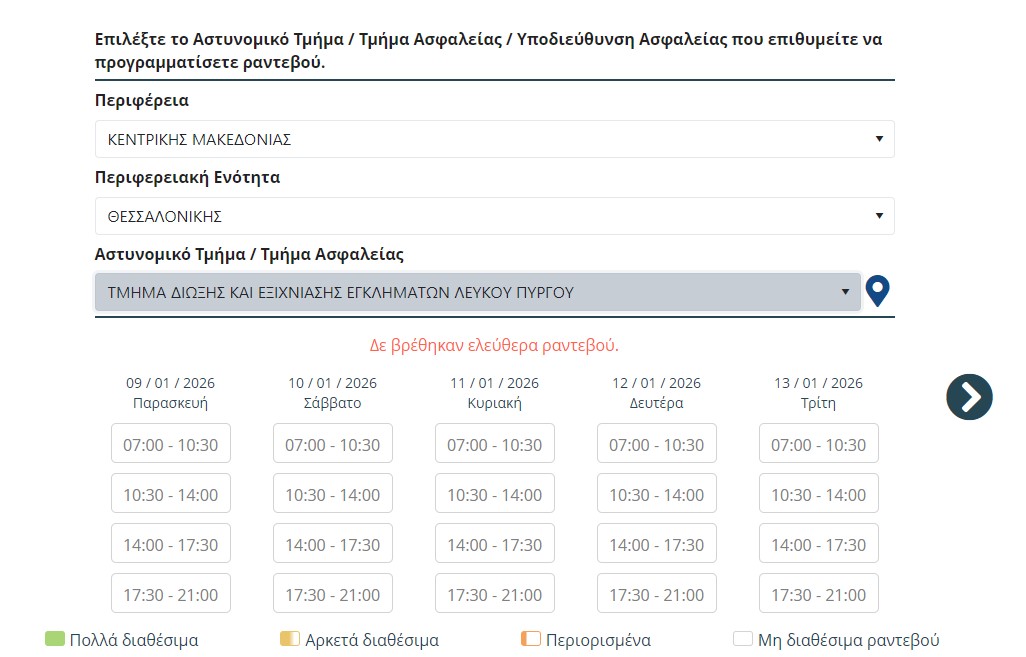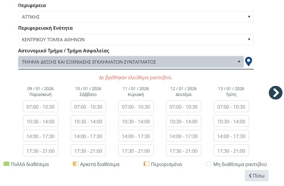 Φαίνεται πως οι πολίτες έχουν σπεύσει να κλείσουν ραντεβού για τις νέες ταυτότητες και, έτσι, τα τμήματα της Αττικής και Θεσσαλονίκης δεν έχουν διαθέσιμες ώρες στην πλατφόρμα, ακόμα και μέχρι τον Απρίλιο.