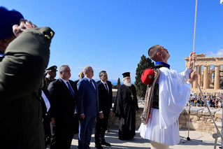 Επίκεντρο των εορτασμών, ο ιερός βράχος της Ακρόπολης, όπου πραγματοποιήθηκε η έπαρση της σημαίας με άγημα της προεδρικής φρουράς, ενώ πλήθος κόσμου παραβρέθηκε στη συγκινητική τελετή.