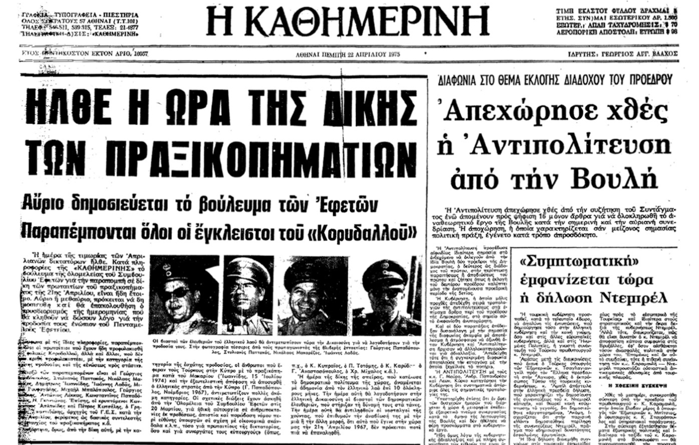 1975: Ξεκινά η δίκη των υπευθύνων για τα γεγονότα του Πολυτεχνείου το 1973, με κατηγορούμενους μεταξύ άλλων τον Γεώργιο Παπαδόπουλο και τον Δημήτριο Ιωαννίδη. Η δίκη αυτή αποτέλεσε μία από τις πιο σημαντικές στην ιστορία της σύγχρονης Ελλάδας.
