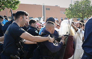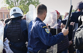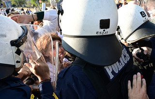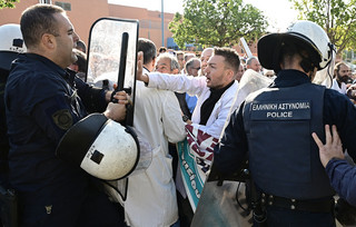 Οι συγκεντρωμένοι κρατούσαν πανό και φώναζαν συνθήματα για τις συνθήκες στα δημόσια νοσοκομεία, ενώ η αστυνομία προσπάθησε να τους απομακρύνει από τον χώρο.