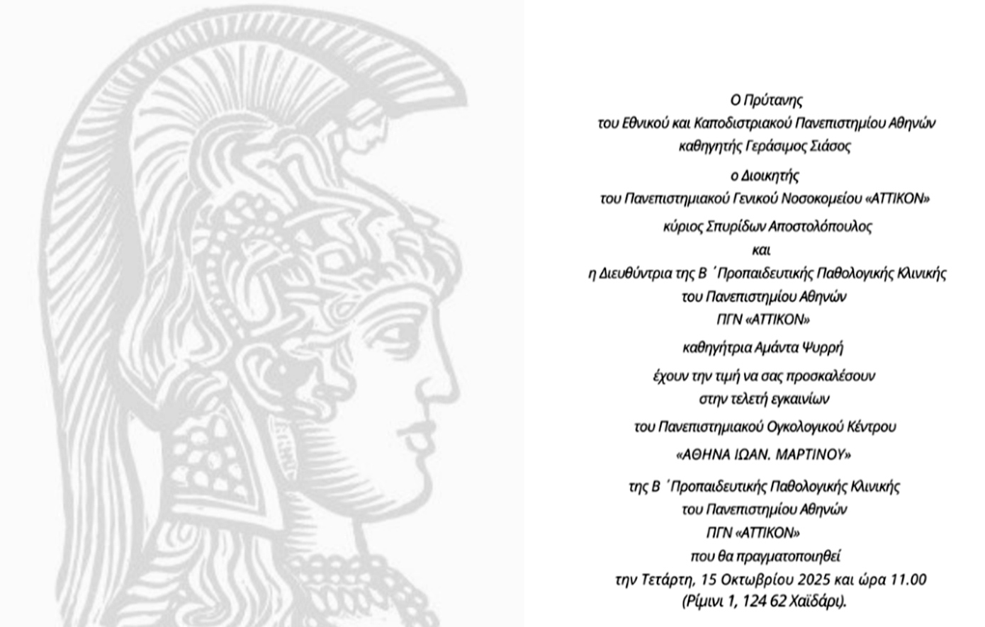 Το Εθνικό και Καποδιστριακό Πανεπιστήμιο Αθηνών και το Πανεπιστημιακό Γενικό Νοσοκομείο «ΑΤΤΙΚΟΝ» σας προσκαλούν στην τελετή εγκαινίων του νέου Πανεπιστημιακού Ογκολογικού Κέντρου «ΑΘΗΝΑ ΙΩΑΝ. ΜΑΡΤΙΝΟΥ», ενός χώρου που δημιουργήθηκε με στόχο να συνδυάσει τη γνώση, την έρευνα και τη φροντίδα, προσφέροντας στους ασθενείς με καρκίνο τις πιο σύγχρονες και ανθρώπινες υπηρεσίες υγείας.