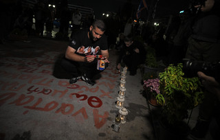 Η κινητοποίηση κορυφώθηκε με μια συμβολική δράση, με τους συγγενείς να βγάζουν πινέλα και μπογιές και με τη βοήθεια και άλλων ανθρώπων, να γράφουν ξανά στο έδαφος, με κόκκινο χρώμα, τα ονόματα των θυμάτων. Ανάμεσά τους ήταν ο Πάνος Ρούτσι, ο Ηλίας Παπαγγελής, ο Βασίλης Χατζηχαραλάμπους και πολλοί ακόμη. Κατά τη διάρκεια αυτής της δράσης, οι συγγενείς ζήτησαν από τον κόσμο να περιφρουρήσει το μνημείο, δημιουργώντας περιμετρικά μια «αλυσίδα».