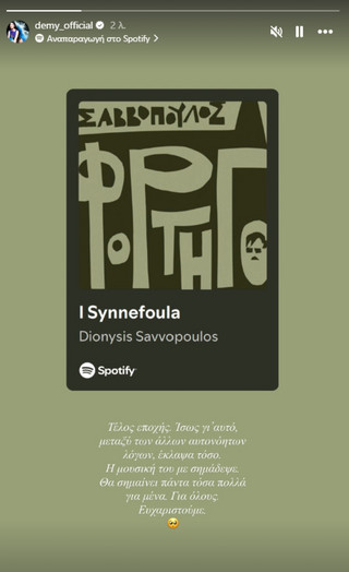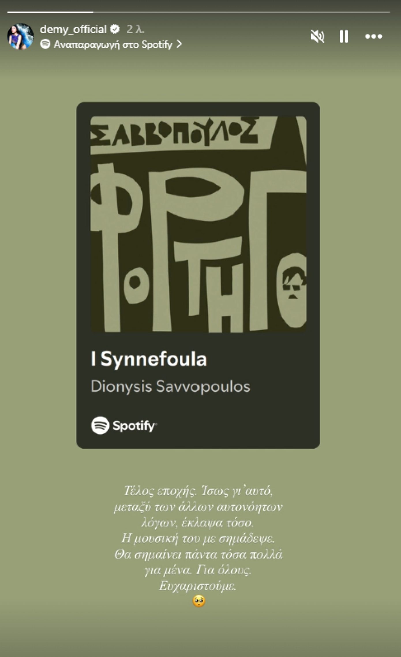 Με μια νοσταλγική ανάρτηση αποχαιρέτησε τον καλλιτέχνη και η Φωτεινή Δάρρα, αναπολώντας τα εφηβικά της χρόνια. «Μια κασέτα παλιά έπαιζε συνέχεια στο κασετόφωνο του δωματίου μου. Ήμουν στην τελευταία τάξη του Λυκείου και είχα ήδη αποφασίσει ότι θα σπούδαζα θέατρο. Πού να ήξερα ότι θα γινόμουν μια ηθοποιός που τραγουδάει», έγραψε αρχικά και συνέχισε: «Κι όλα αυτά με τους ήχους από τους Αχαρνείς του Αριστοφάνη και του Διονύση Σαββοπουλου». Στο τέλος της ανάρτησης σημείωσε: «Αντίο Νιόνιο. Τελικά τα χρόνια έτρεξαν χύμα. Τέλος εποχής».