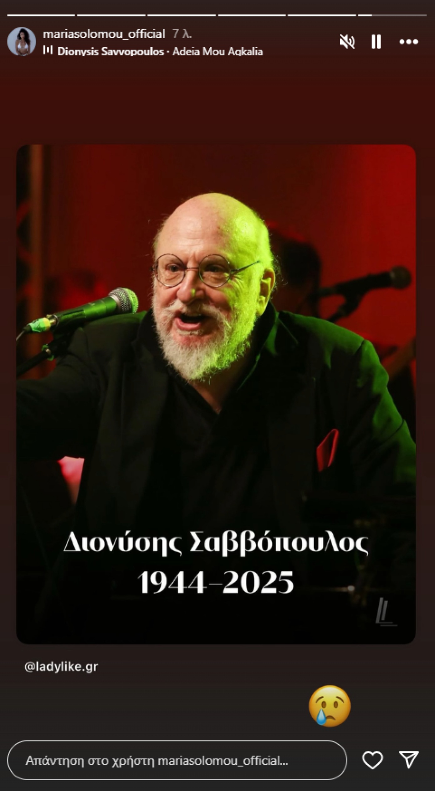 Η Μαρία Μπακοδήμου ανέφερε πως «ένιωσε σαν να έχασε την εφηβεία της» μαθαίνοντας την είδηση, συνοδεύοντας την ανάρτησή της με τη λεζάντα: «Σαν να έχασα την εφηβεία μου νιώθω με αυτή την αναχώρηση. Καλό ταξίδι κύριε Σαββόπουλε».