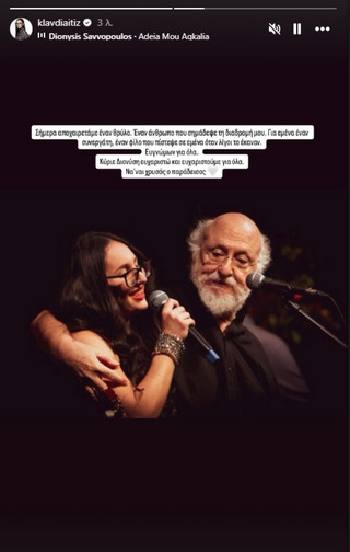 Ανάμεσα στους νεότερους καλλιτέχνες που μίλησαν με συγκίνηση ήταν και η Κλαυδία, η οποία είχε συνεργαστεί μαζί του. Ανάρτησε μια κοινή τους φωτογραφία γράφοντας: «Σήμερα αποχαιρετάμε έναν θρύλο. Έναν άνθρωπο που σημάδεψε τη διαδρομή μου. Για εμένα έναν συνεργάτη, έναν φίλο που πίστεψε σε εμένα, όταν λίγοι το έκαναν. Ευγνώμων για όλα. Κύριε Διονύση, ευχαριστώ και ευχαριστούμε για όλα. Να ‘ναι χρυσός ο παράδεισος».